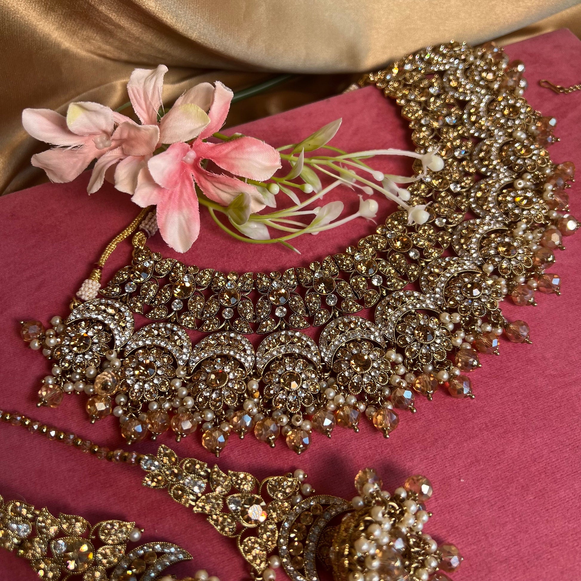 Antique Gold and Champagne Bridal Set Indian/ Pakistani Style/Necklace/ Choker/ Earring/ Tikka/ Mathapatti/Mala/Jhumar