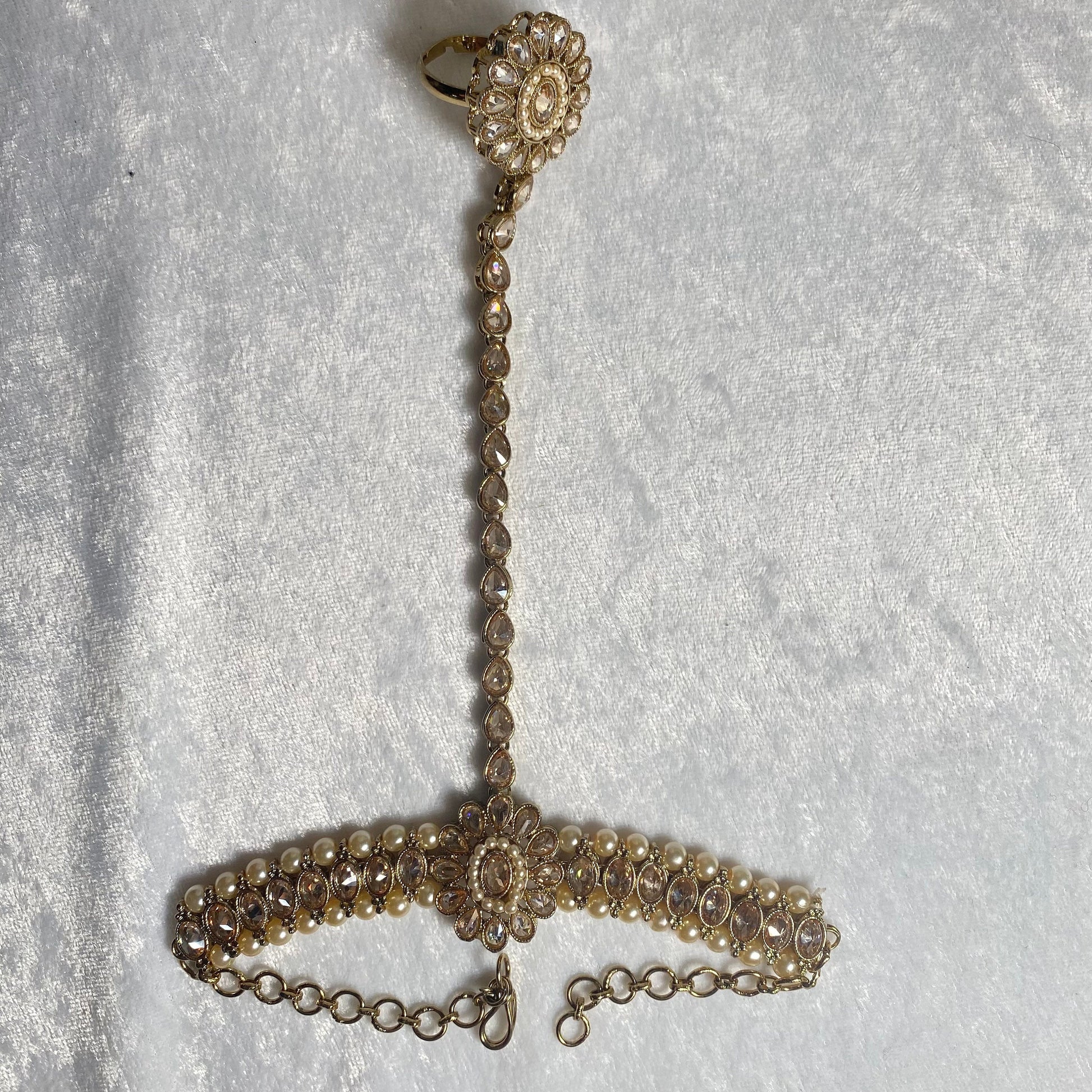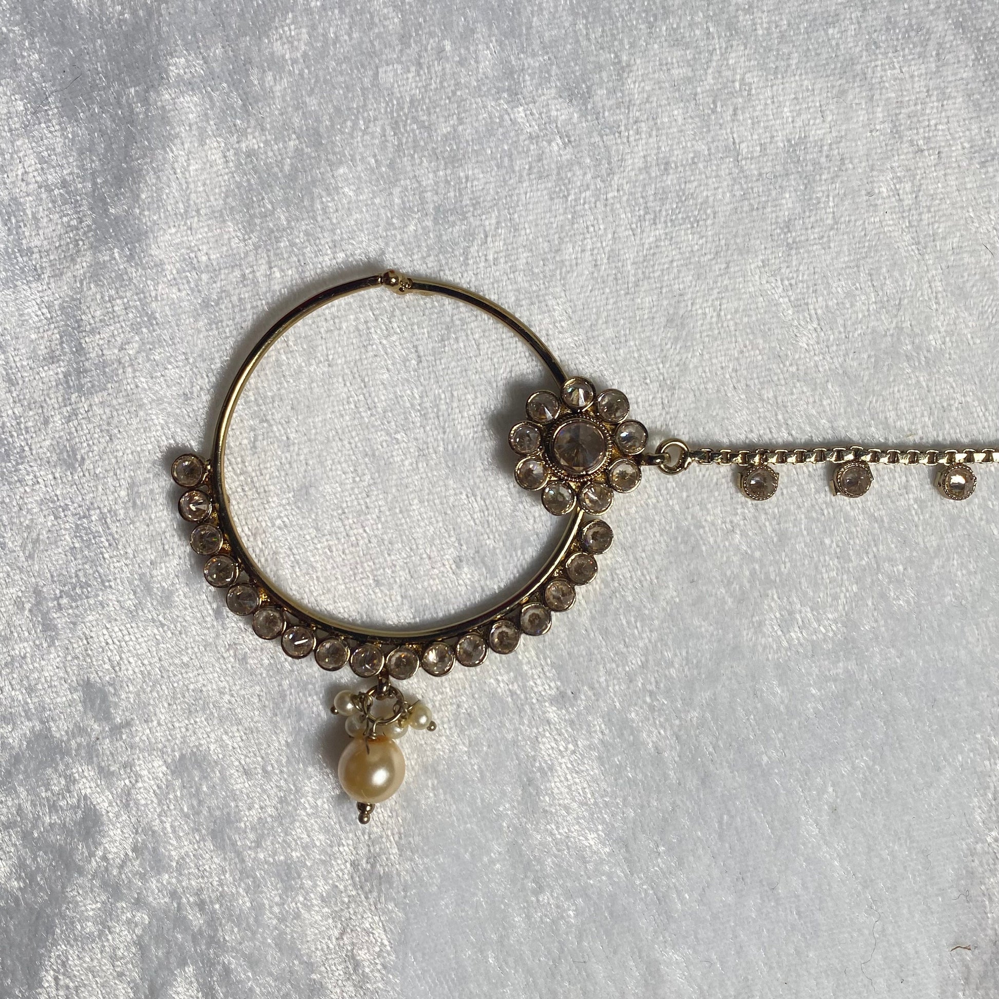 Beautiful antique gold bridal necklace set with champagne stones and pearl beads. Includes necklace, earrings with attached ear chains, long haar, mathapatti, 2 hand harness and slide type nose ring.