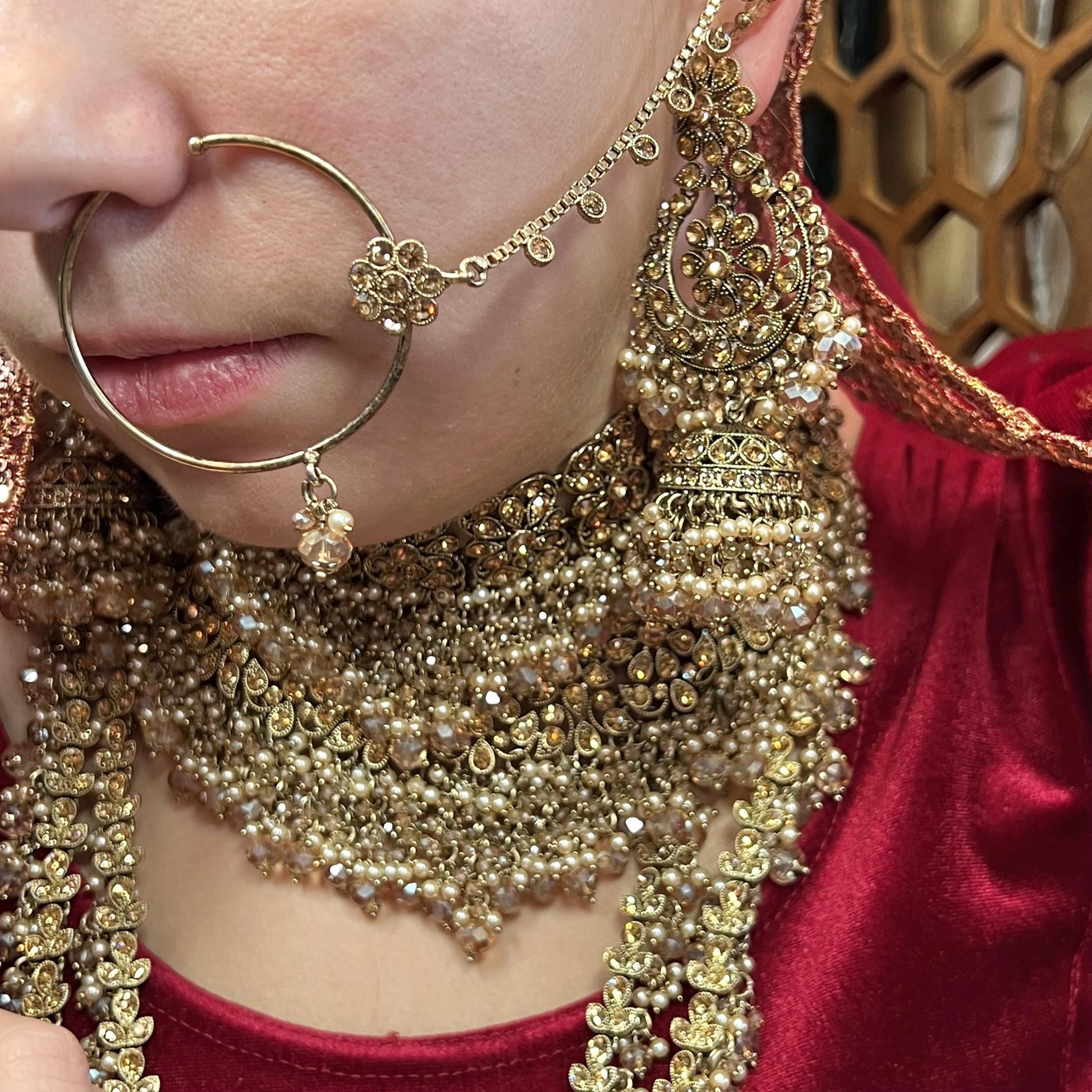 This stunning double set bridal set comes in antique gold base with champagne beads and golden stonework. Includes choker, necklace, long mala, 2 hand harnesses, jhumka earring with attached ear chain, jhumar and tikka.