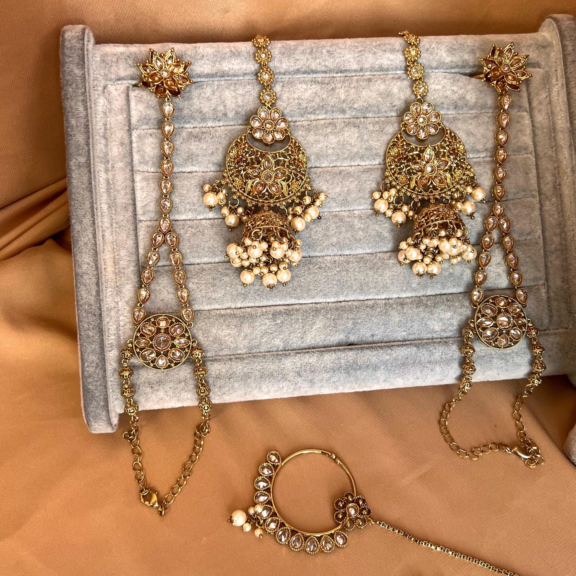 Pearly choker set comes with champagne stone work matching jhumka earrings with detachable ear chains, mathapatti (this can be turned into tikka option only drop us a message), long mala, hand harness x 2 and a medium slide type nose ring.