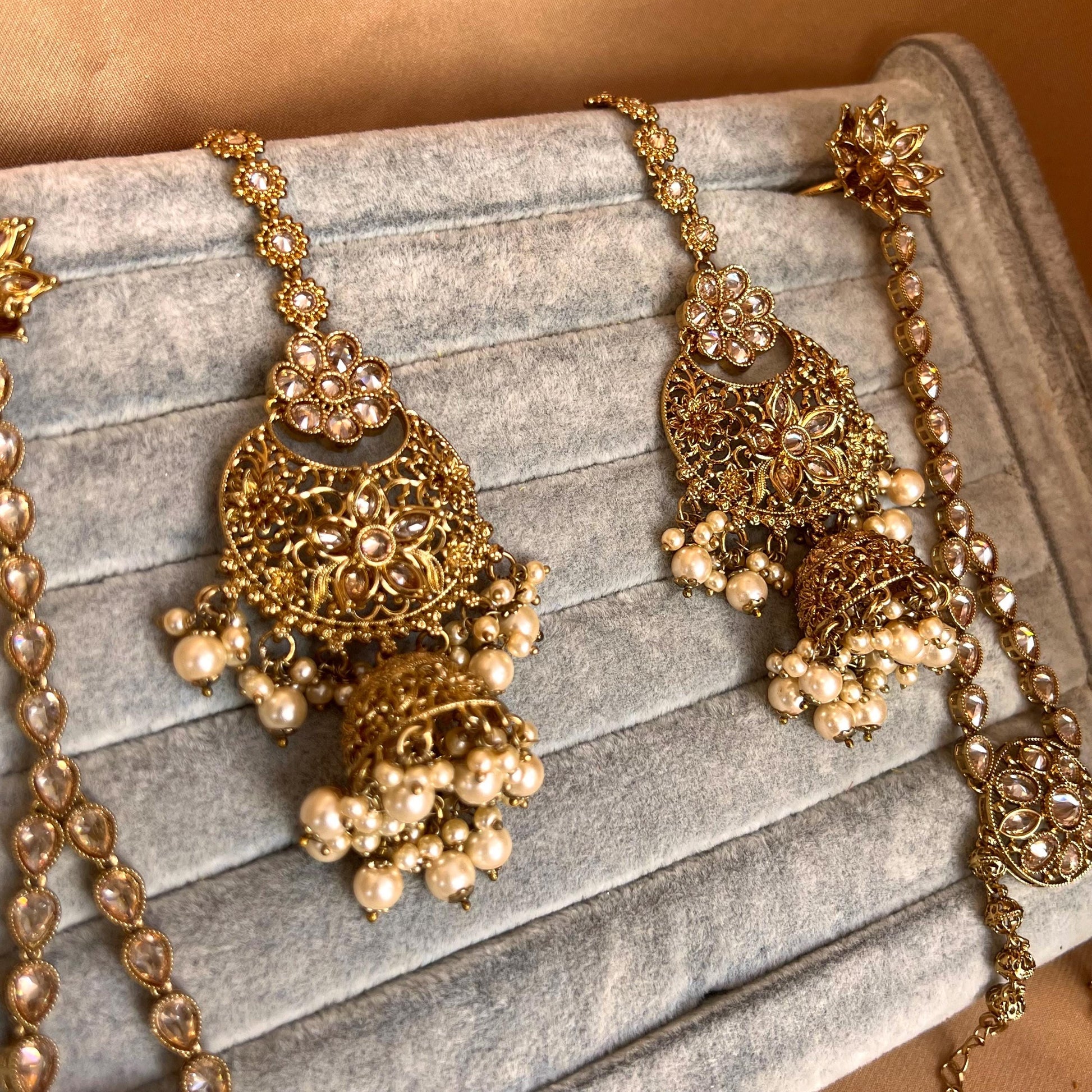 Pearly choker set comes with champagne stone work matching jhumka earrings with detachable ear chains, mathapatti (this can be turned into tikka option only drop us a message), long mala, hand harness x 2 and a medium slide type nose ring.