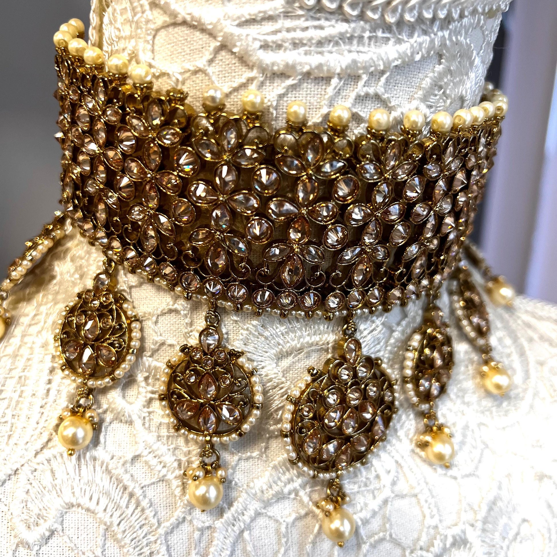 Antique Gold & Champagne Bridal Choker Set - with earring and tikka. Indian Pakistani Bollywood Jewellery