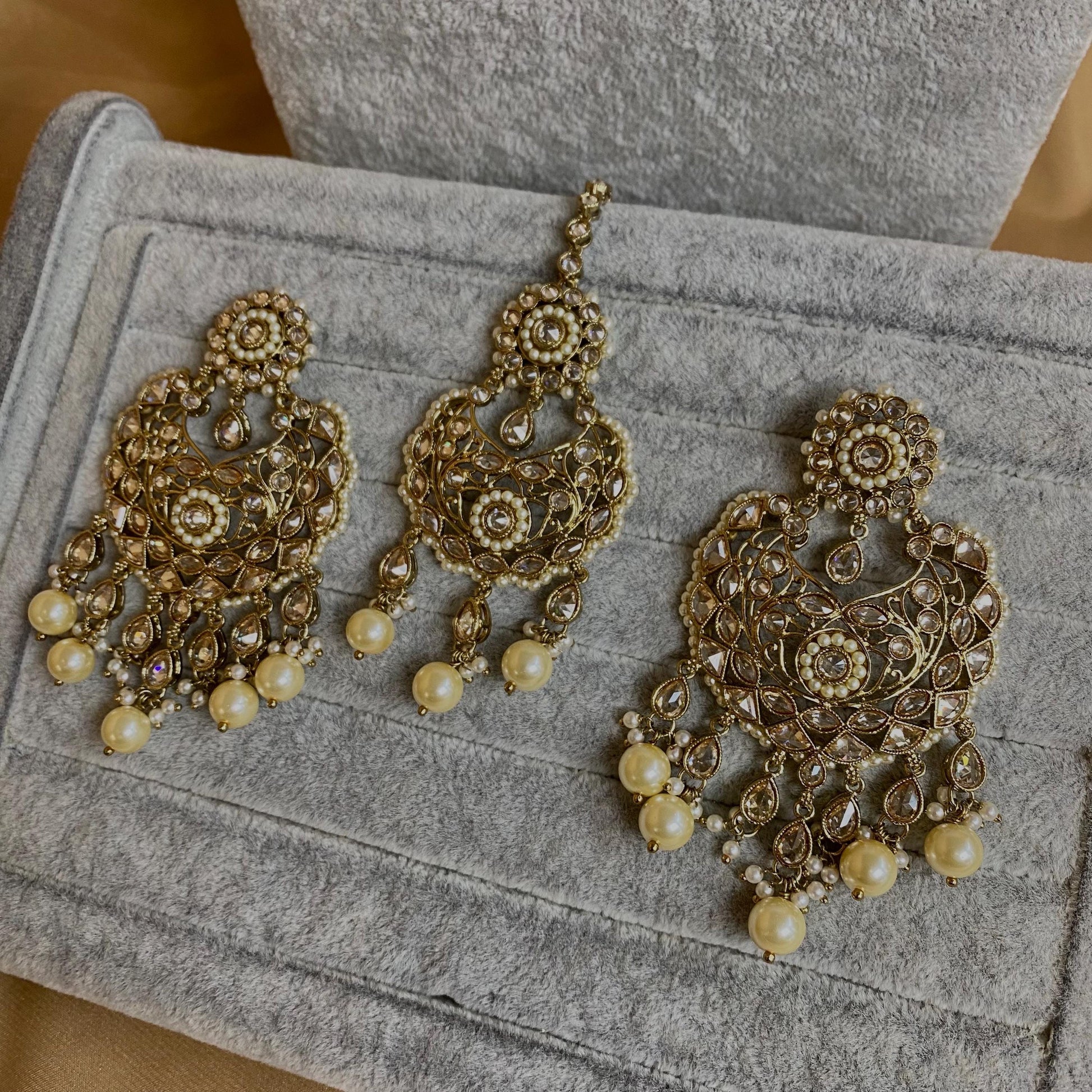 Antique gold & champagne Bridal necklace set Indian/ Pakistani Style/Wedding/Earring/Tikka