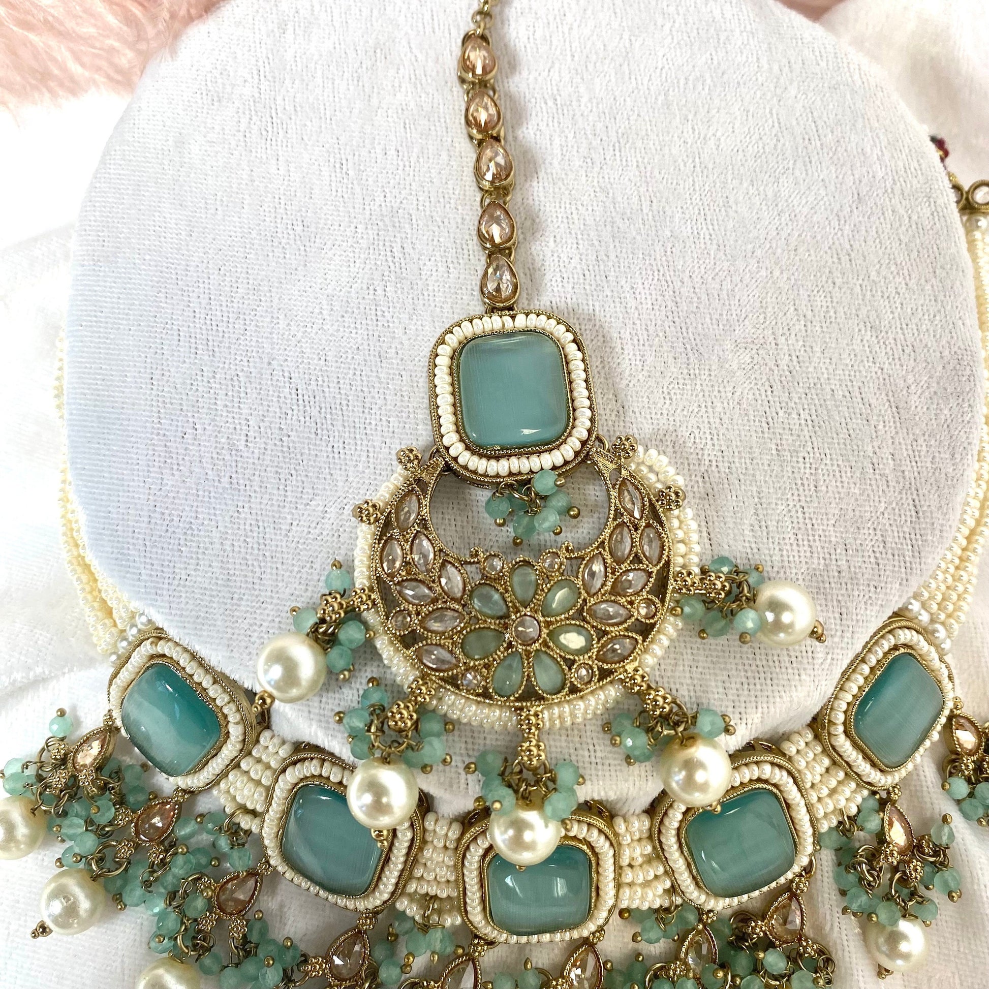 This antique gold choker set with matching earrings and tikka with pearl and colourful beadwork. This comes in 4 different colours pastel blue, pink, peach and ruby. This beautiful choker is flexible to fit any size.