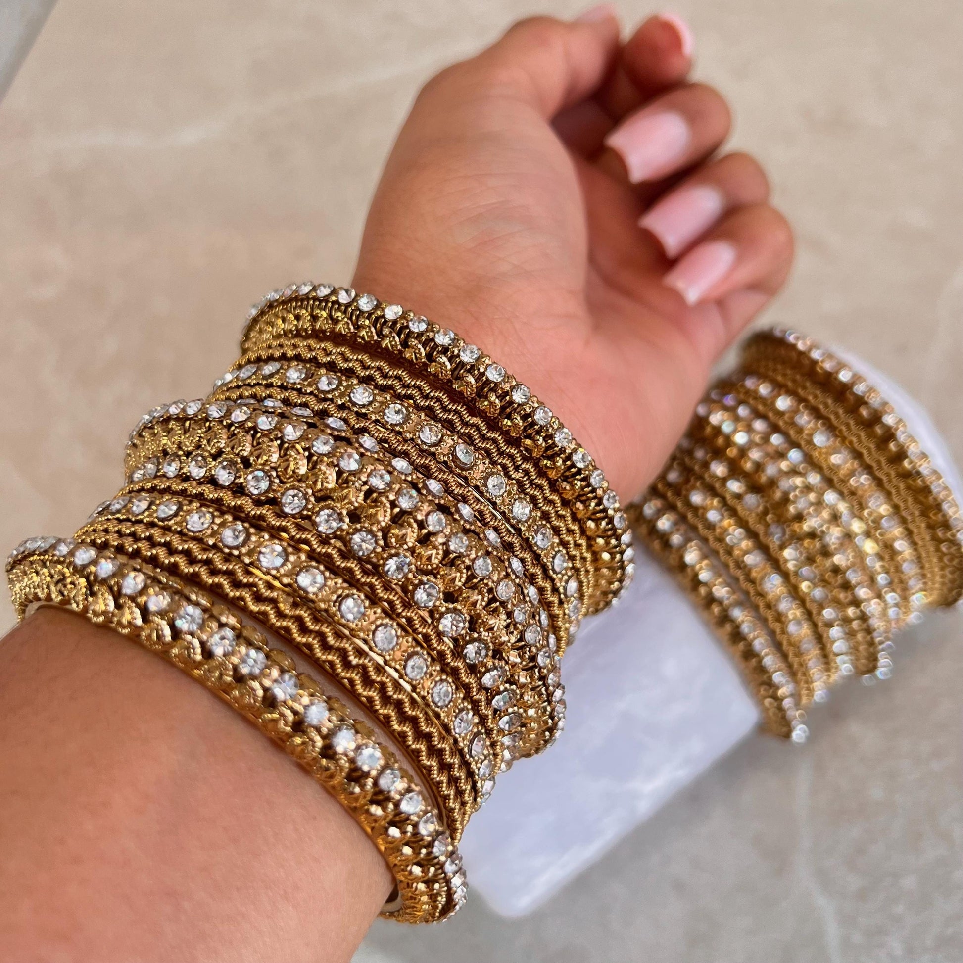 Antique Gold Clear Crystal Sparkly Chunky Bangle Set Indian Pakistani Punjabi Party Fashion Churi Wedding High Quality Gift Both Arm SALE