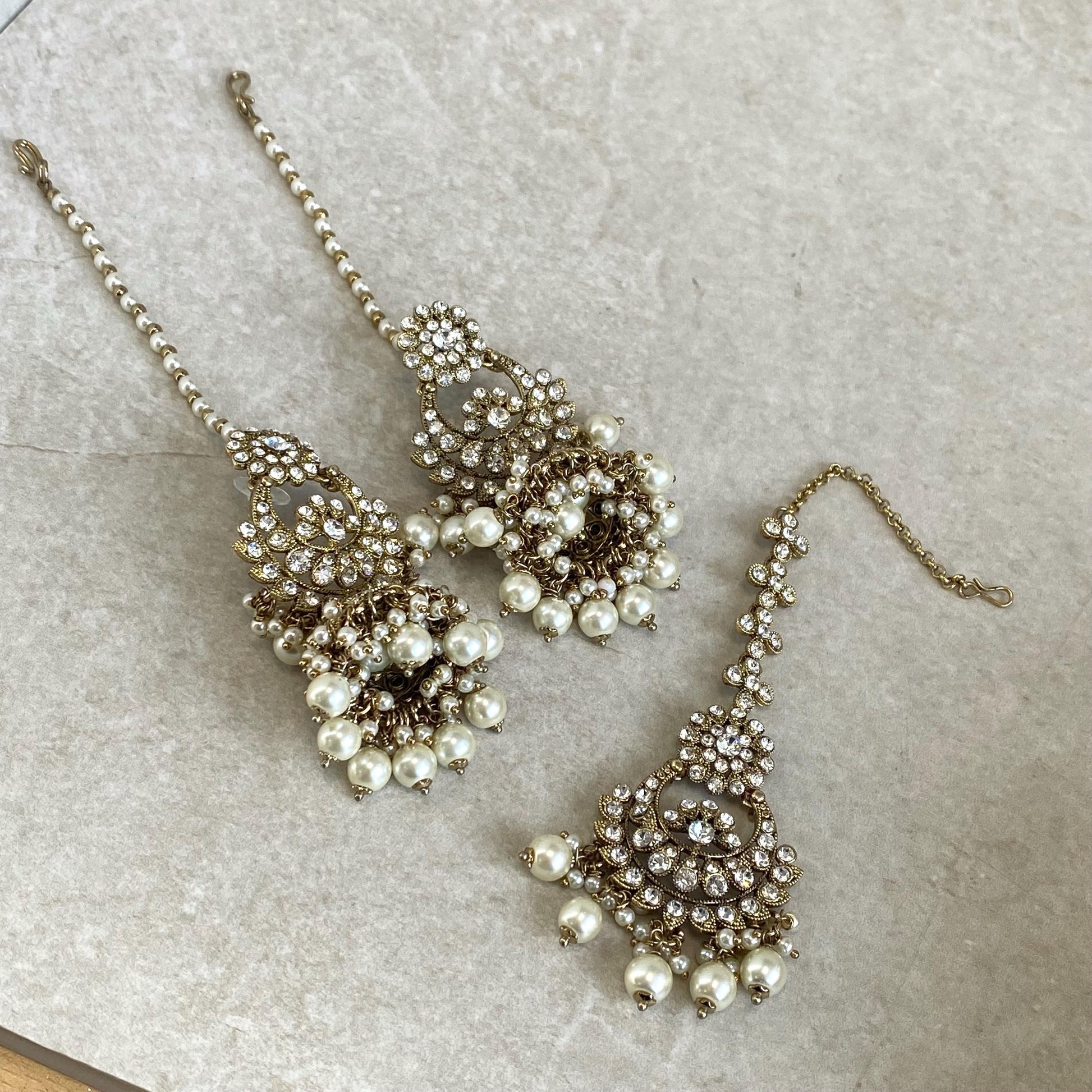 Antique gold base with clear/ silver rhinestones and pearl detail. Earring with chain and tikka
