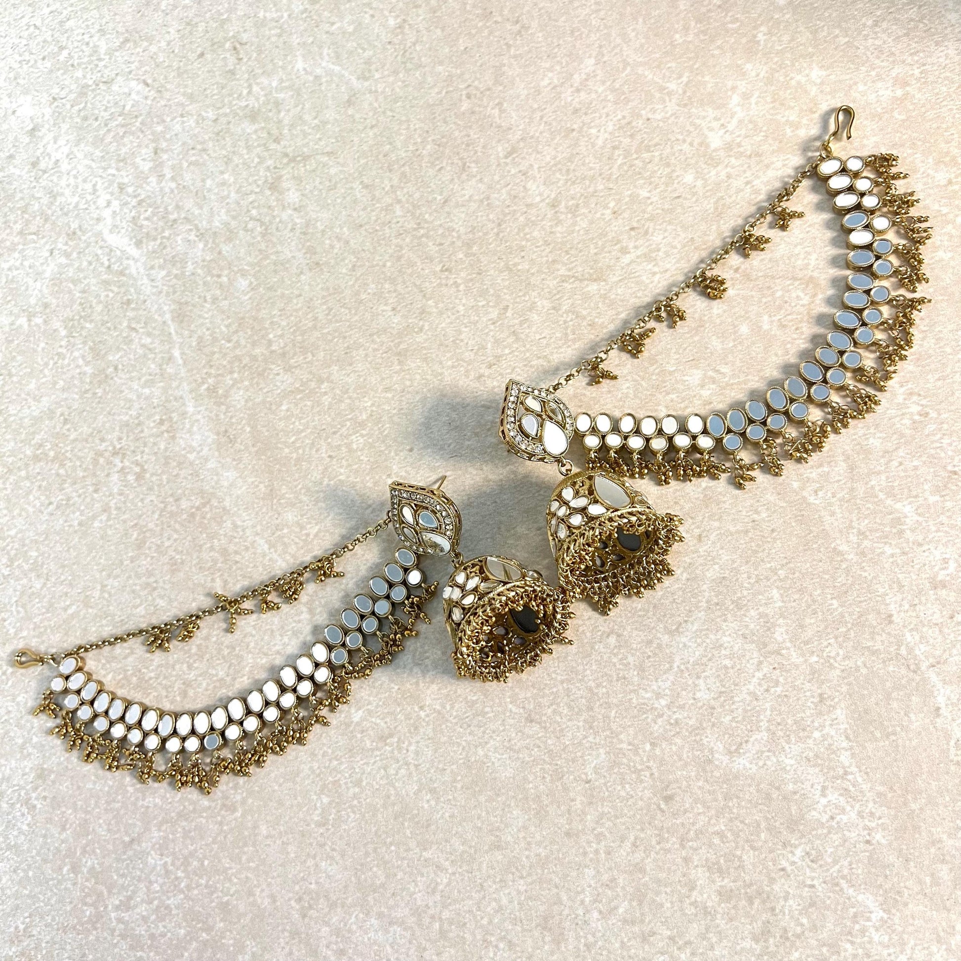 Antique Gold/Golden Mirror Detail Jhumka Earrings With Ear Chains/Saharay/ Indian Style Earring