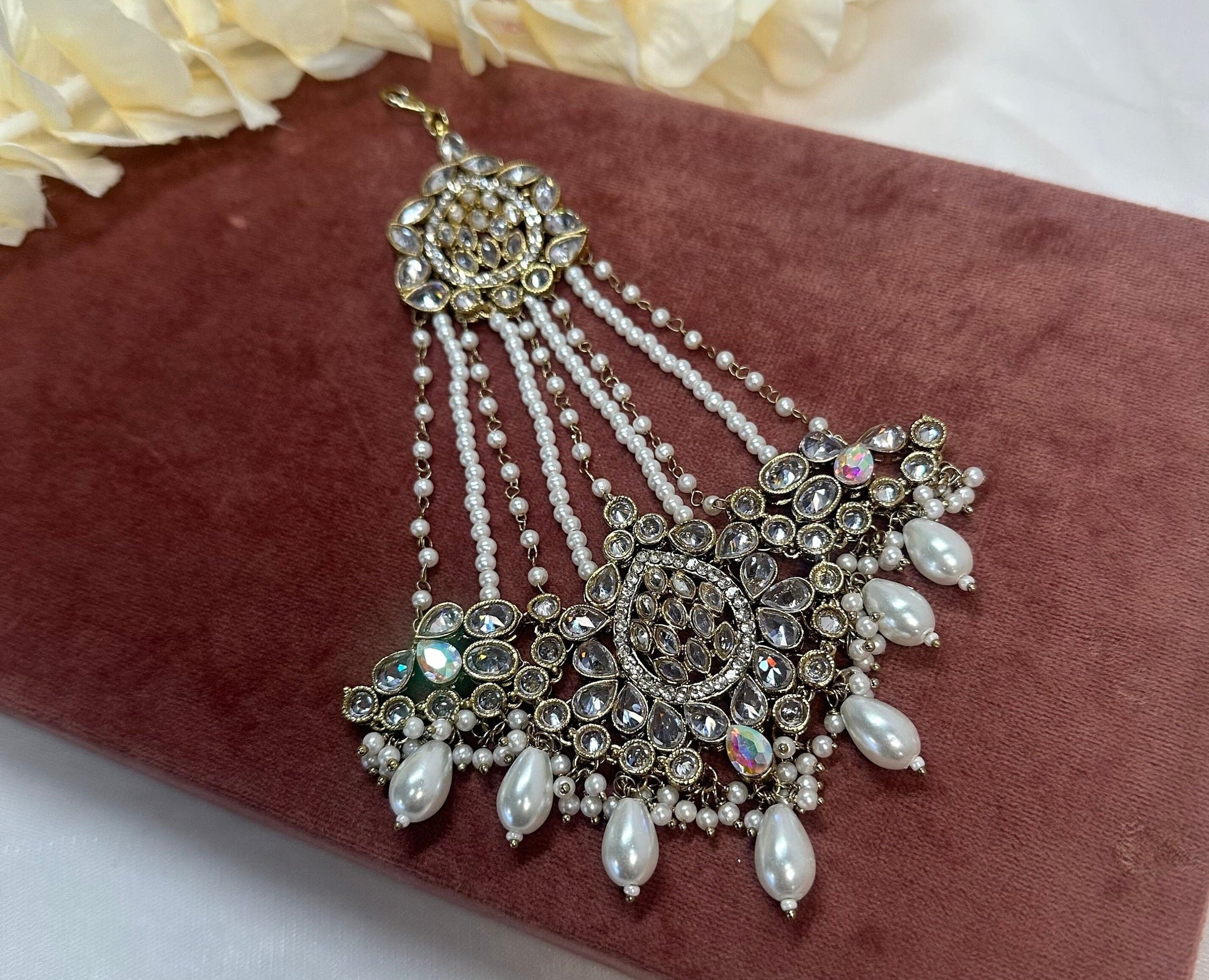 This antique gold jhumar with clear irresdecent stones and white beads. Perect for a sequin outfit