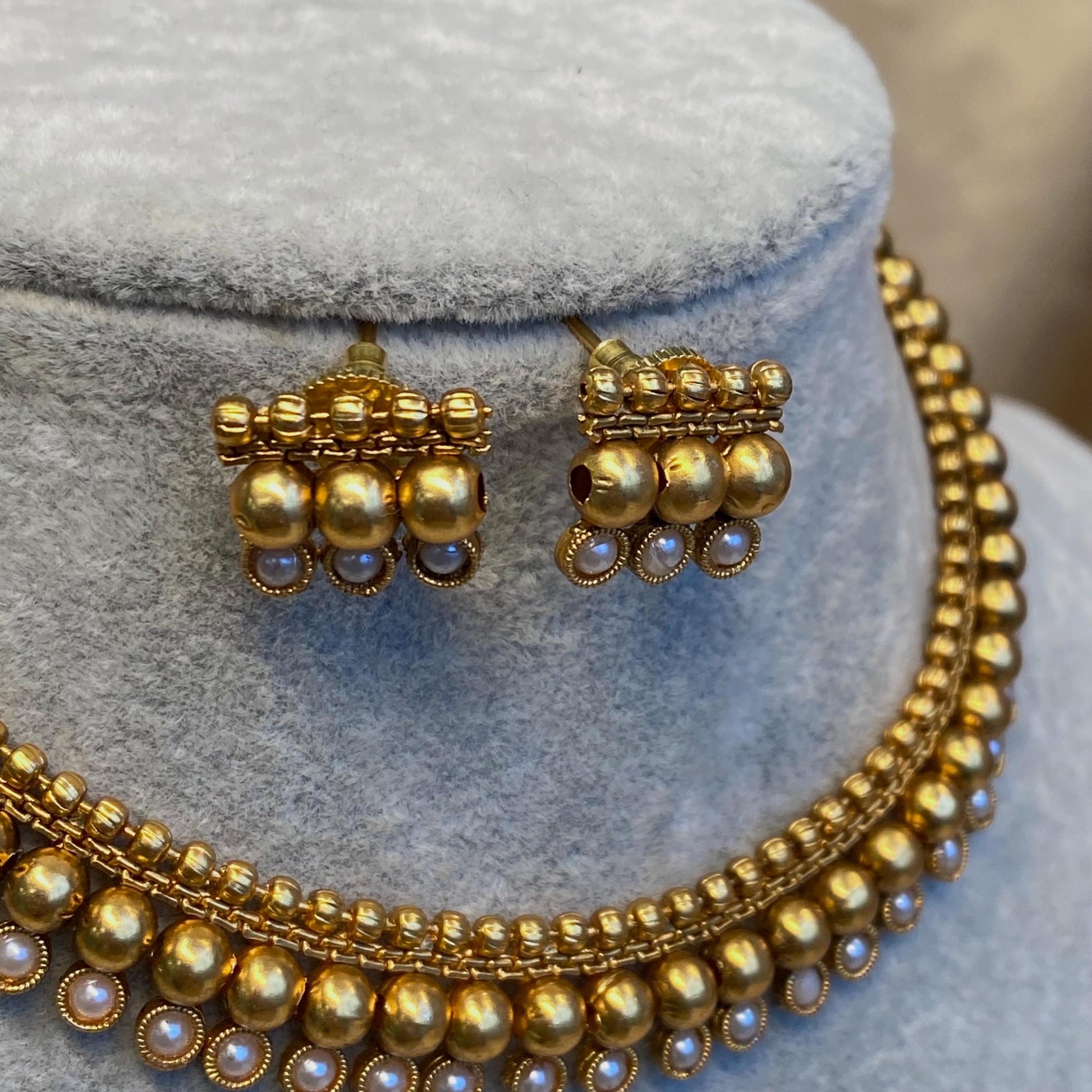 Antique Gold Slim Necklace and Small Stud Earring with Pearl Indian Pakistani Bollywood Style Fashion Gift for Her