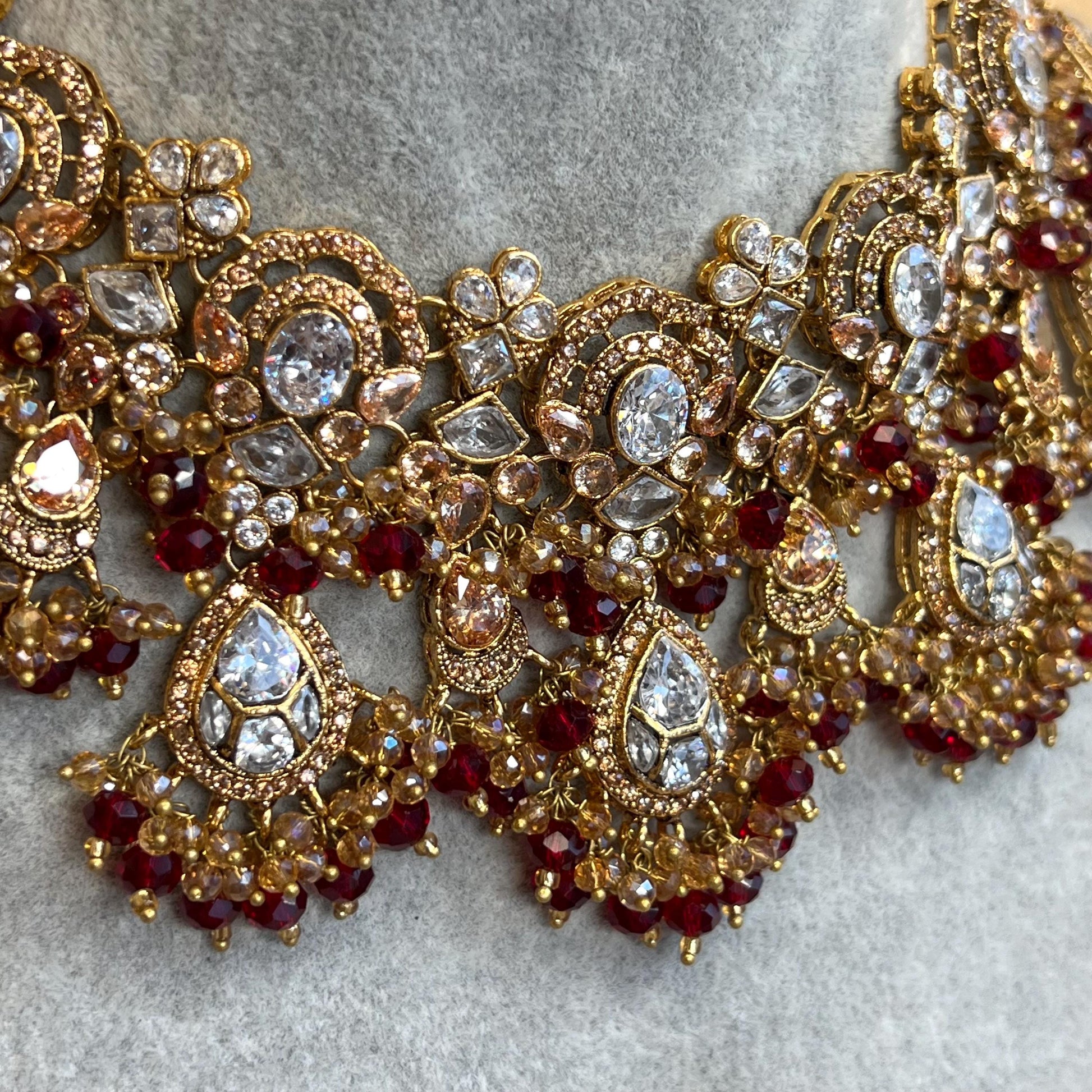 Regal and classic antique gold bridal choker set with dazzling champagne/clear zircon crystals and maroon stones. Plus maroon glass beads. Perfect bridal set for a royal look