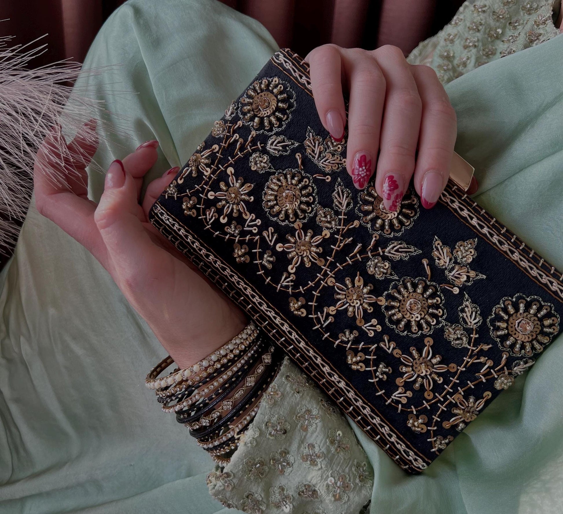 Black Antique Gold Embellished Handcrafted Clutch Bag/Embroidered Clutch Bag/Gifts/Black Hand Bags/Evening Clutch Bag/Purse