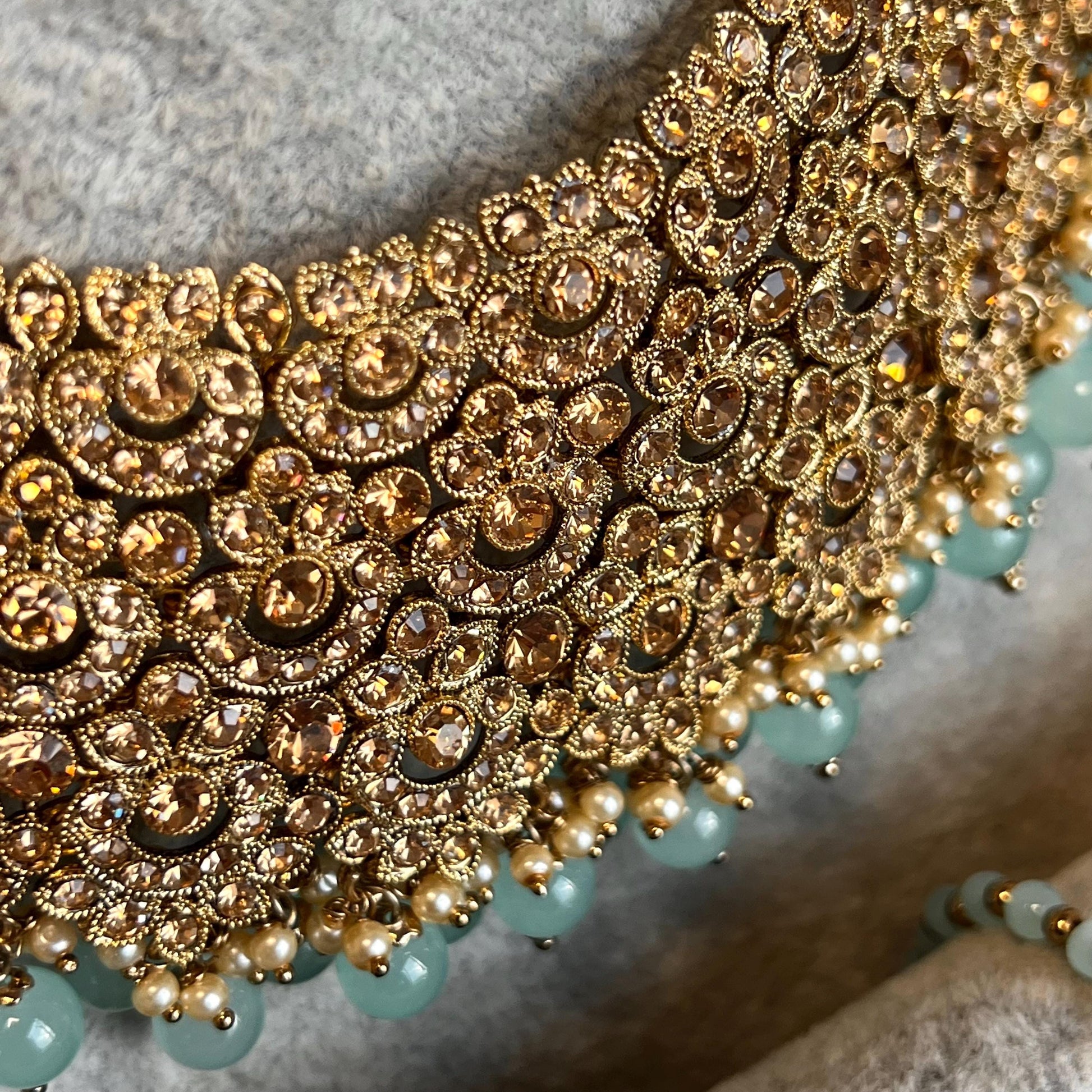 This stunning blue and antique gold bridal necklace set comes with matching jhumka earrings, tikka made with beautiful rhinestones