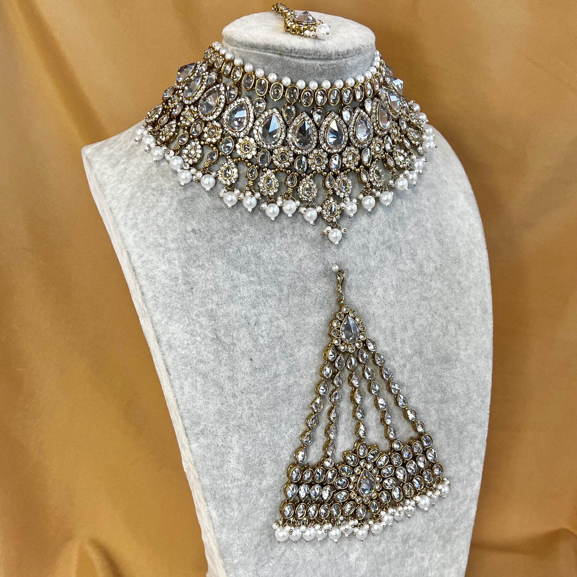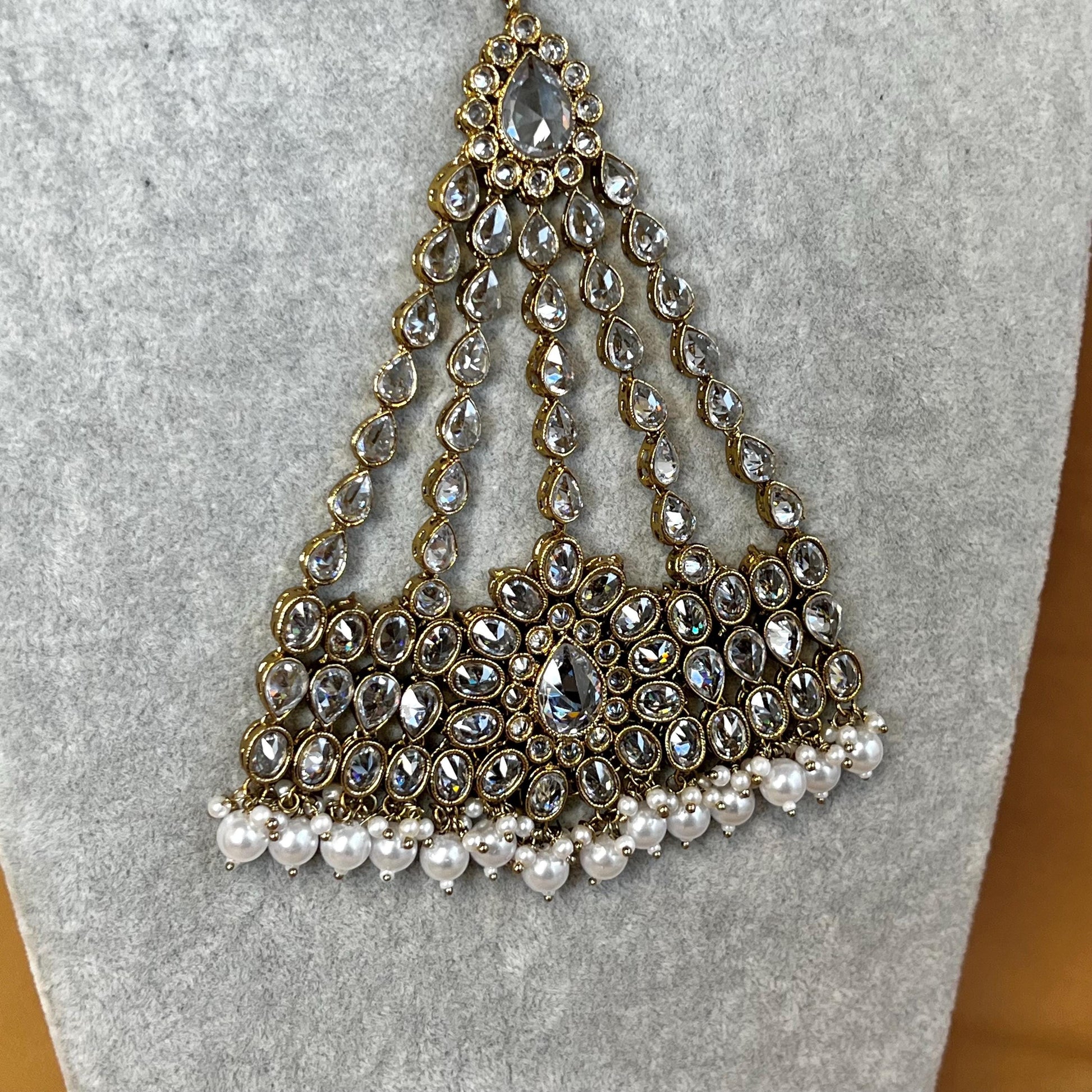 Bridal Clear Necklace Jhumar & Tikka - Antique Gold Base Clear Stonework/ White Bead Jewellery