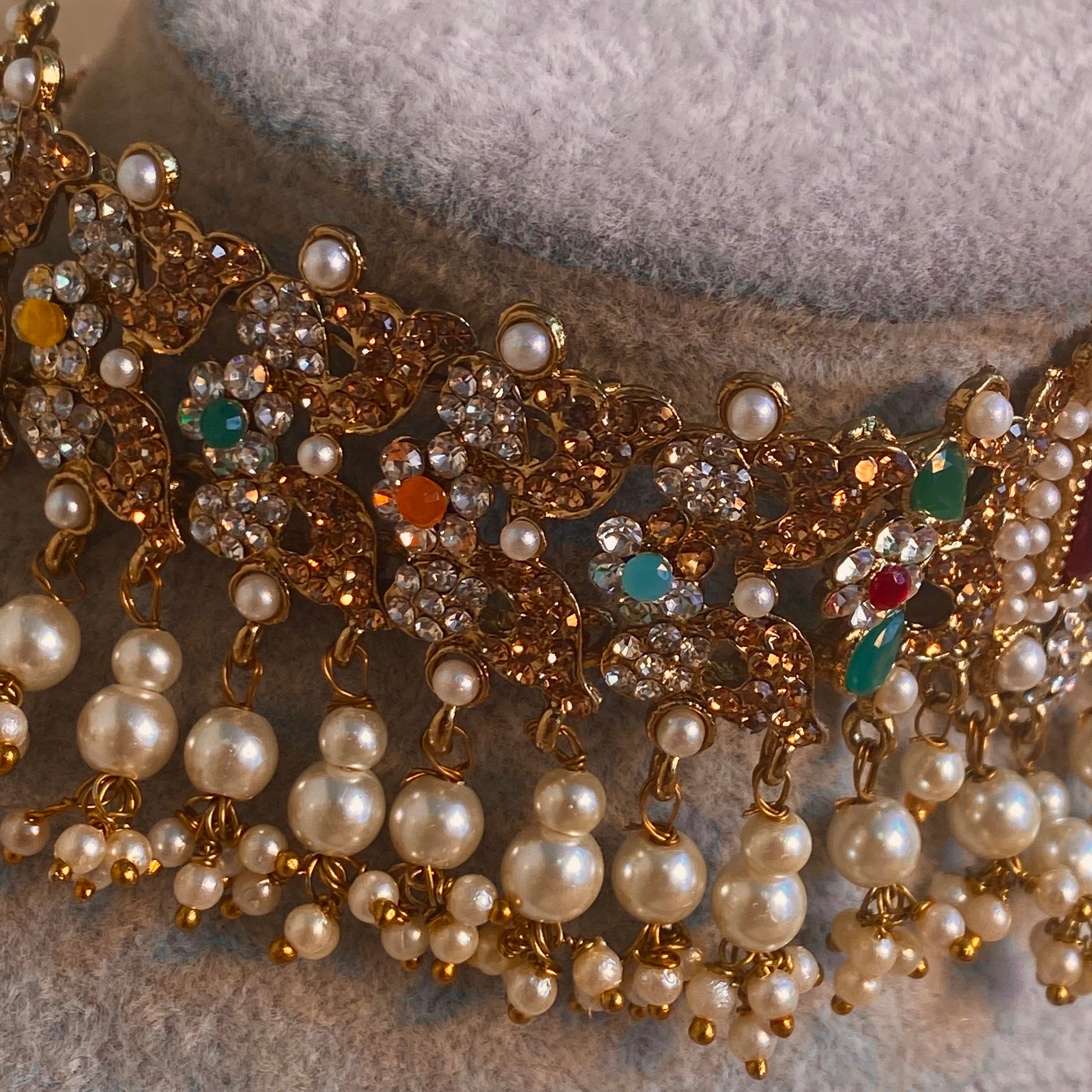 Stylish gold choker set adorned with sparkling golden and multi colour rhinestones and pearl beads, pearl detail earrings, tikka and jhumar.