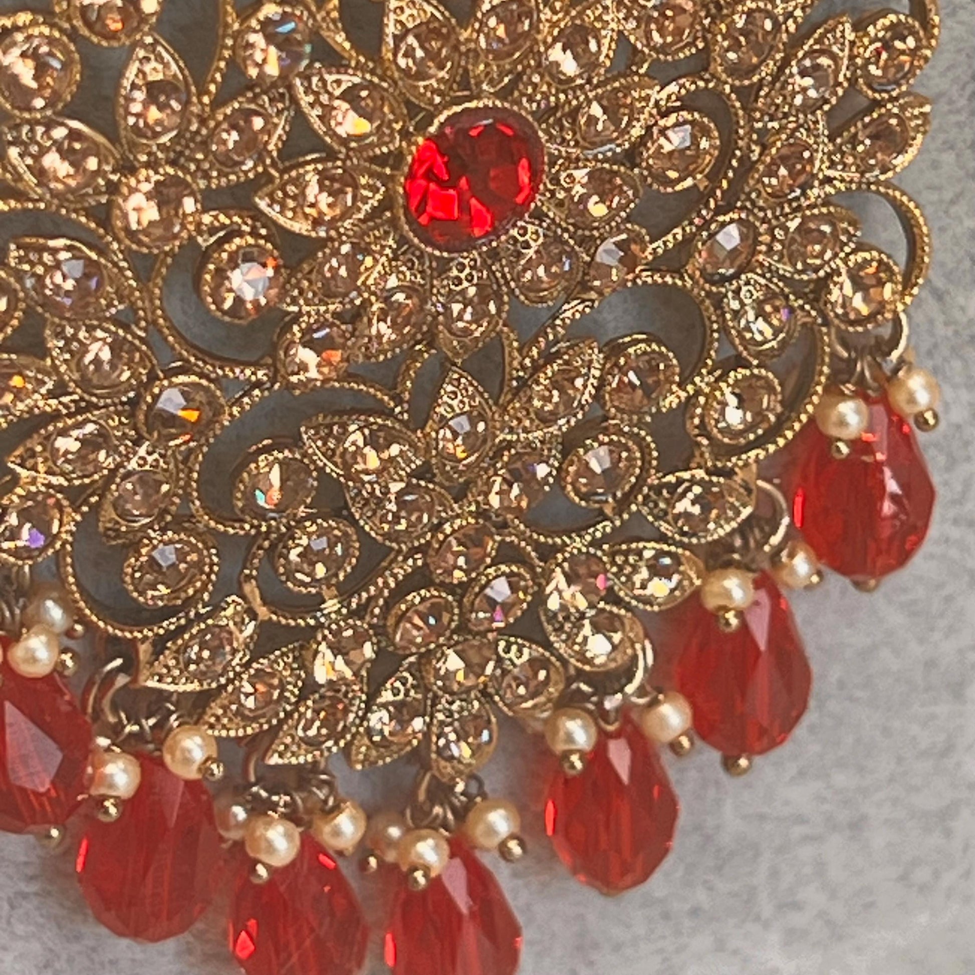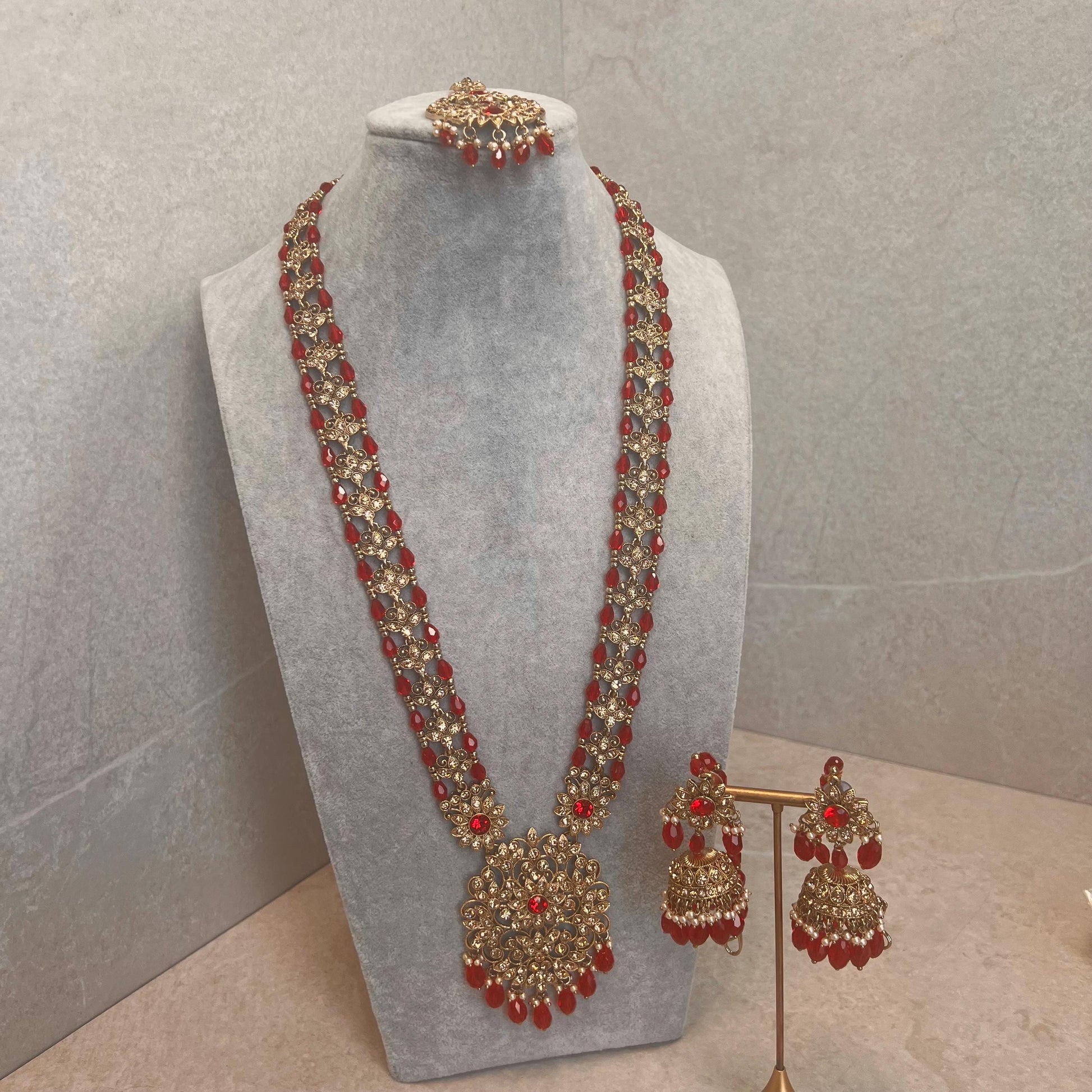 Bridal Red/Golden Long Mala/ Haar/ Long Necklace Set Earring Tikka / Unique Style/ Indian/ Pakistani/Fashion Jewellery/ Gift for her