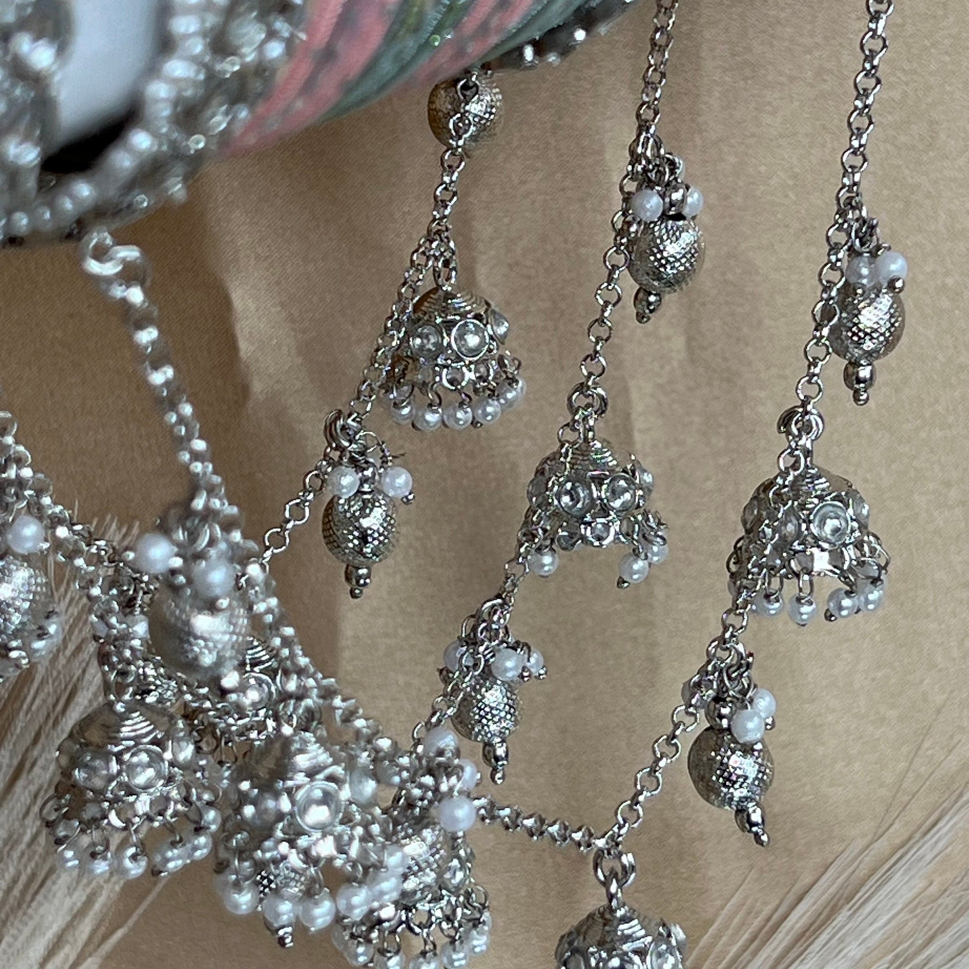 Connected silver jhumka bangles - chain hanging from both end bangles.