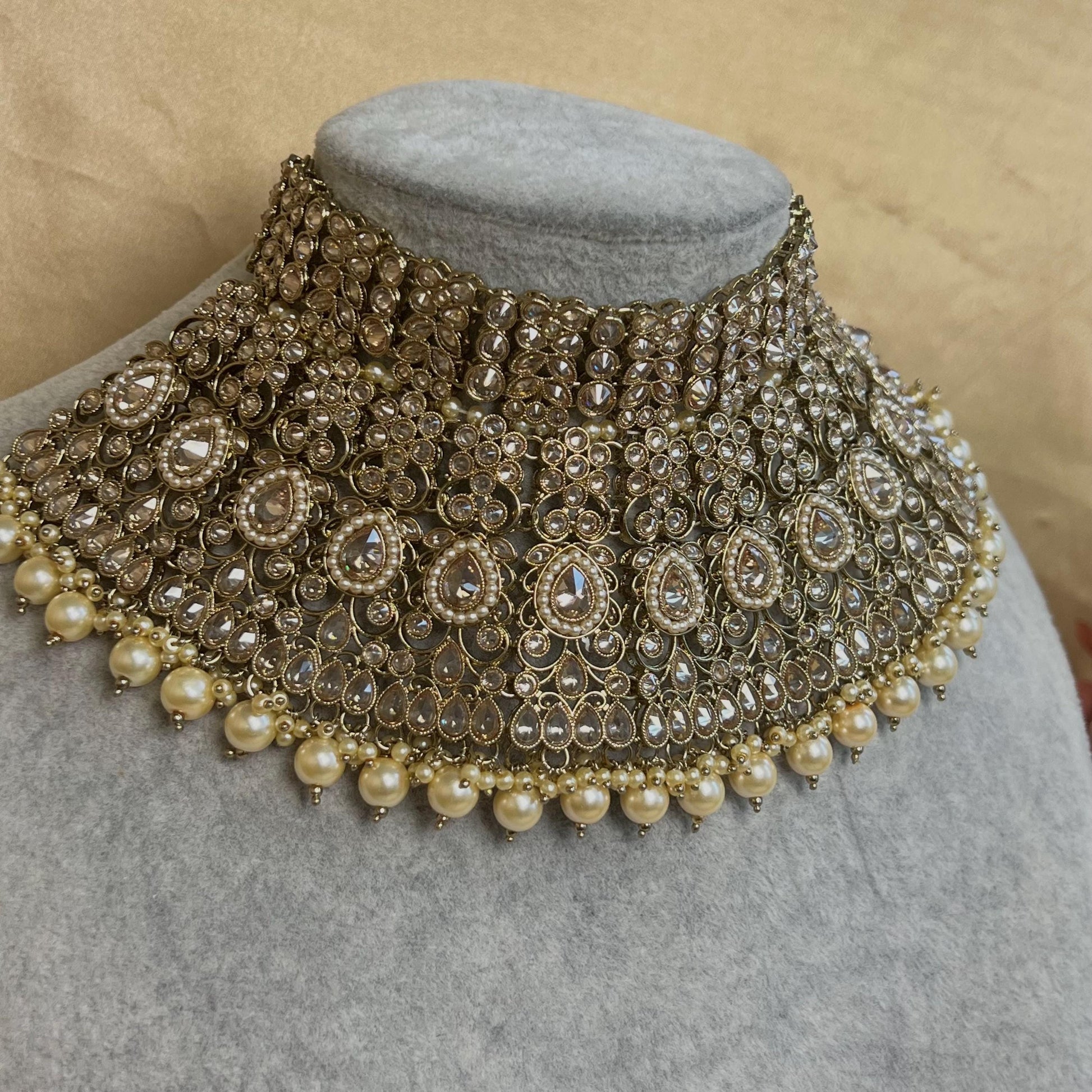 Champagne & Antique Gold Full Bridal set Indian/ Pakistani Style/ Wedding/ Fashion Jewellery/ Necklace set