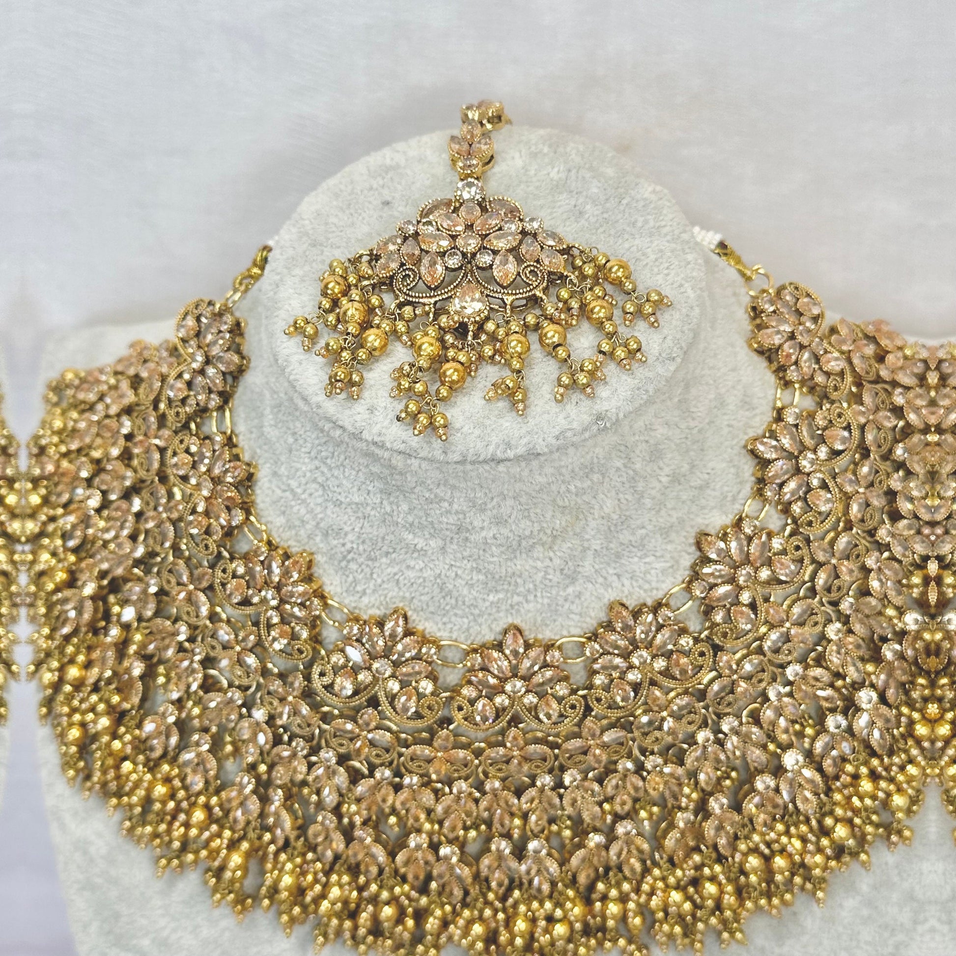 This bright gold necklace with champagne stones comes with matching tikka and jhumar (NO EARRINGS)