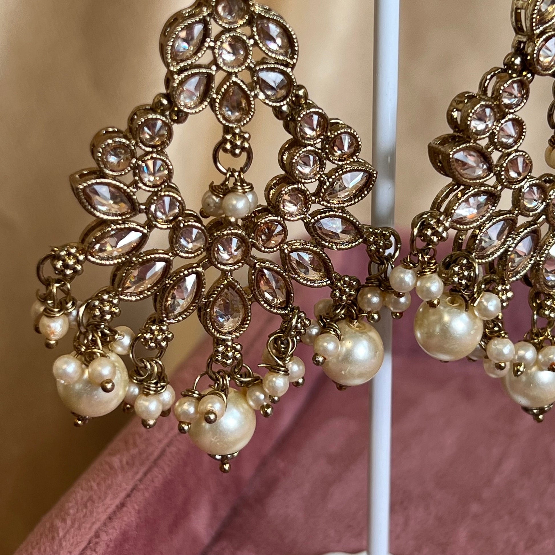 Antique gold base with champagne zircon crystals and pearl detail. Includes earring and tikka only !