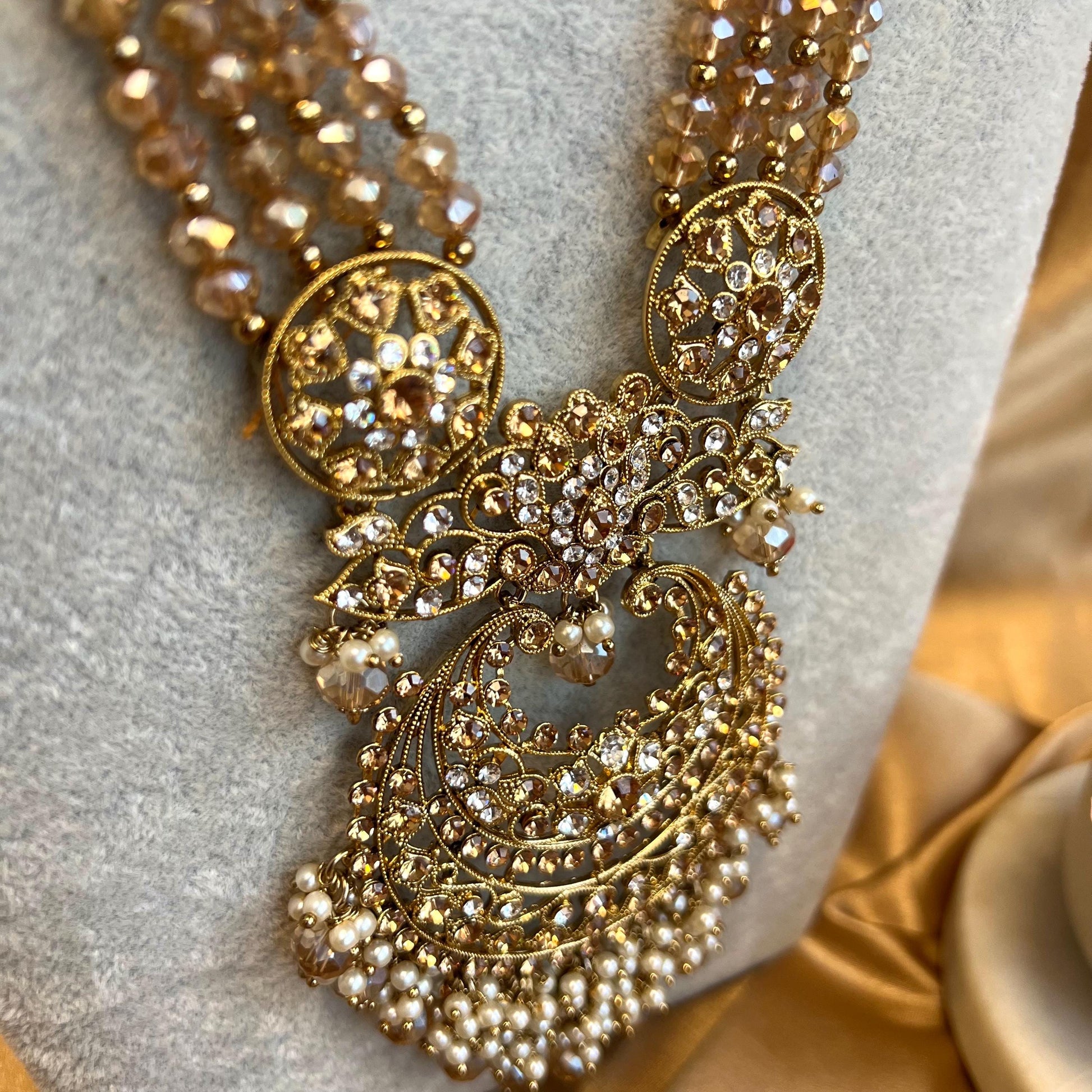 Champagne Long Necklace Mala Haar Heavy High Quality Golden Rhinestone Adjustable Indian Pakistani Bollywood Wedding Fashion Desi Jewellery