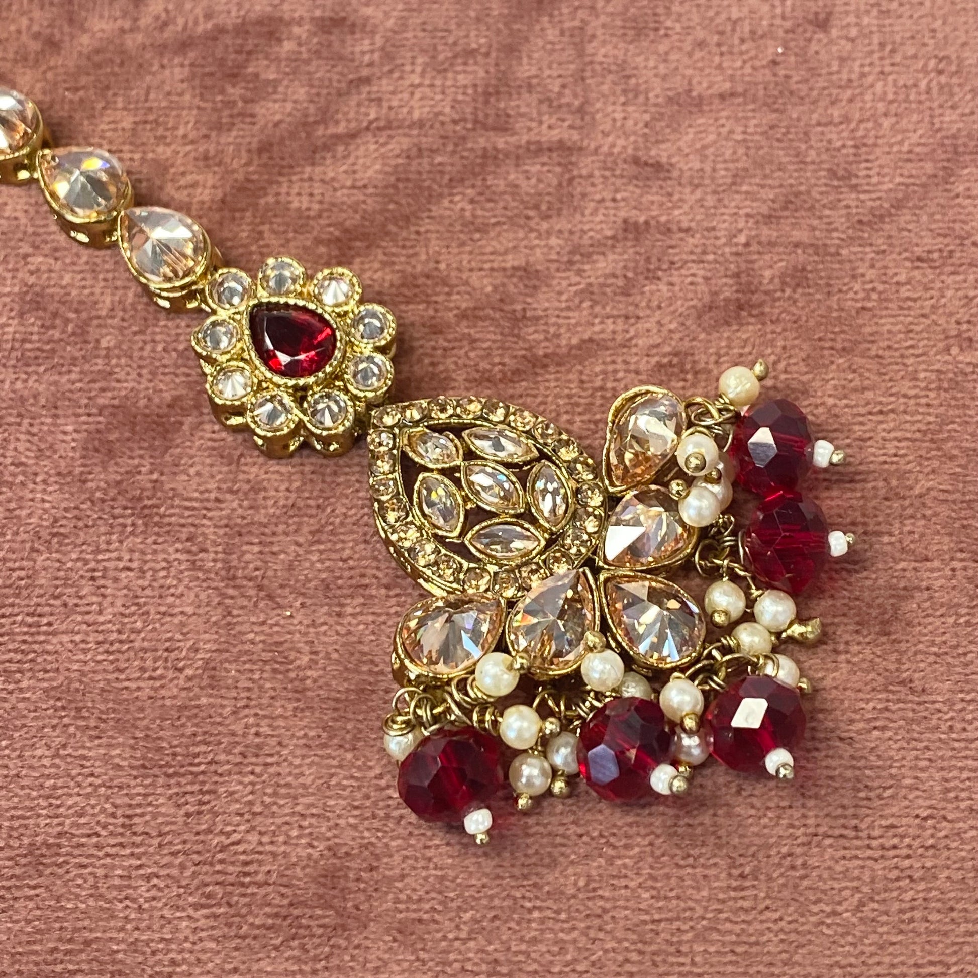 Antique gold base with champagne colour zircon crystals and maroon beads. 4 inch length x 1 inch wide