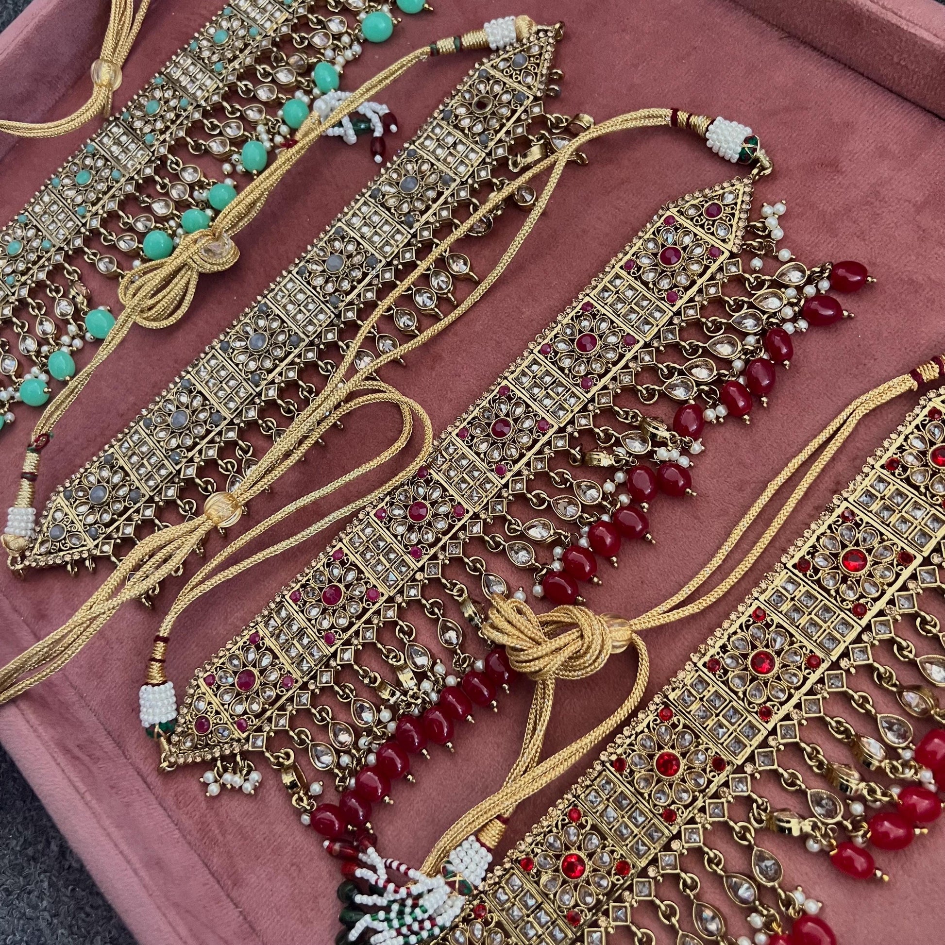 This beautiful multicolour choker set comes with matching Jhumka earrings and small tikka.