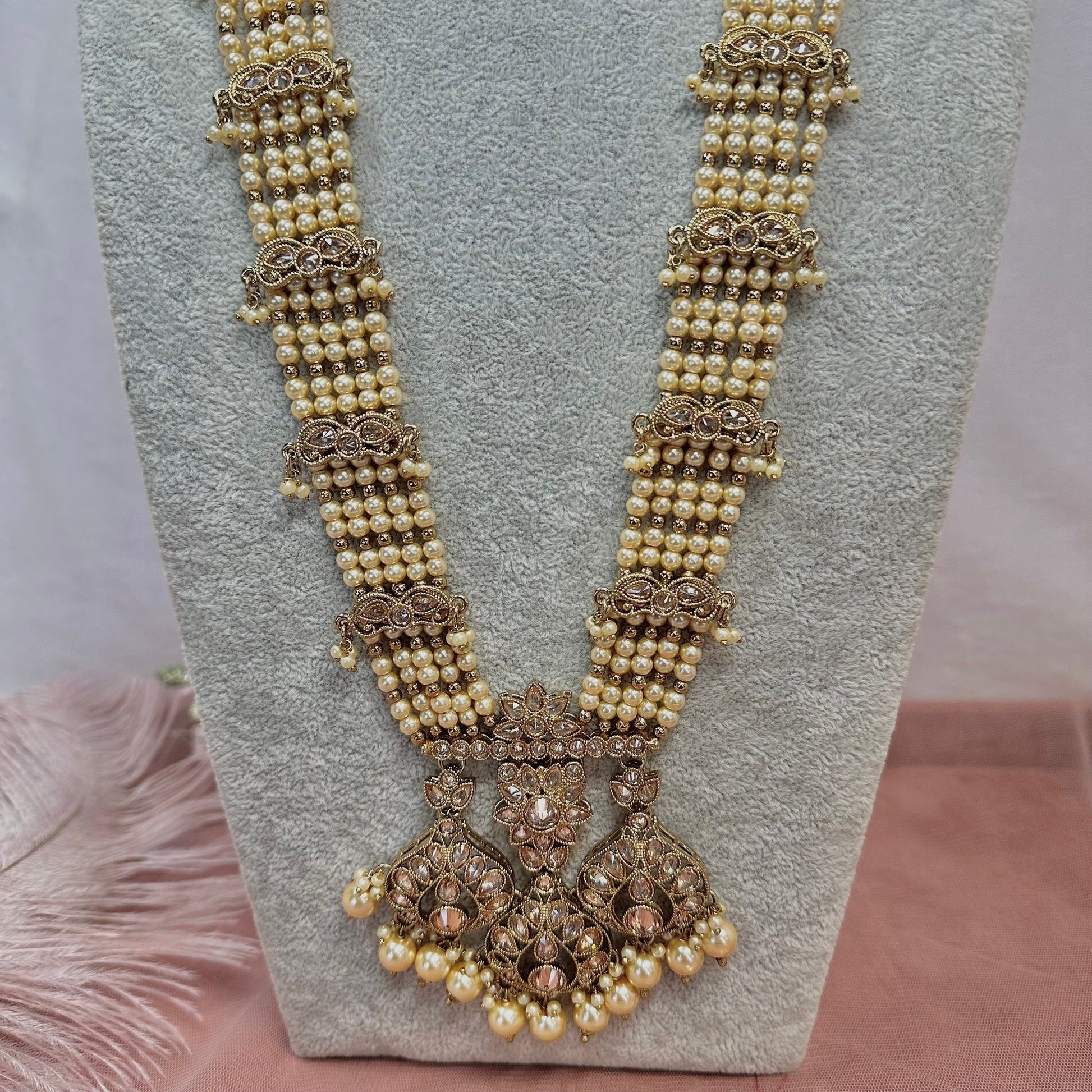 Champagne stones antique gold long mala necklace with cream pearls and beautiful pendant detail.