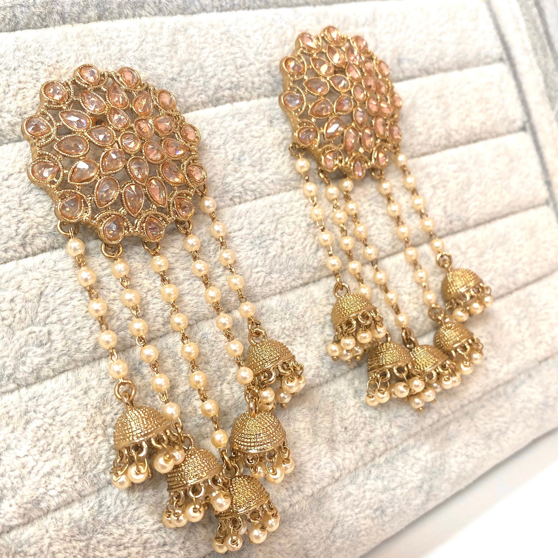 This pretty golden jhumka earrings with champagne crystal is apprioxmately 1.5 inch length x 1.5 inch wide stud x 2 inch Tassle