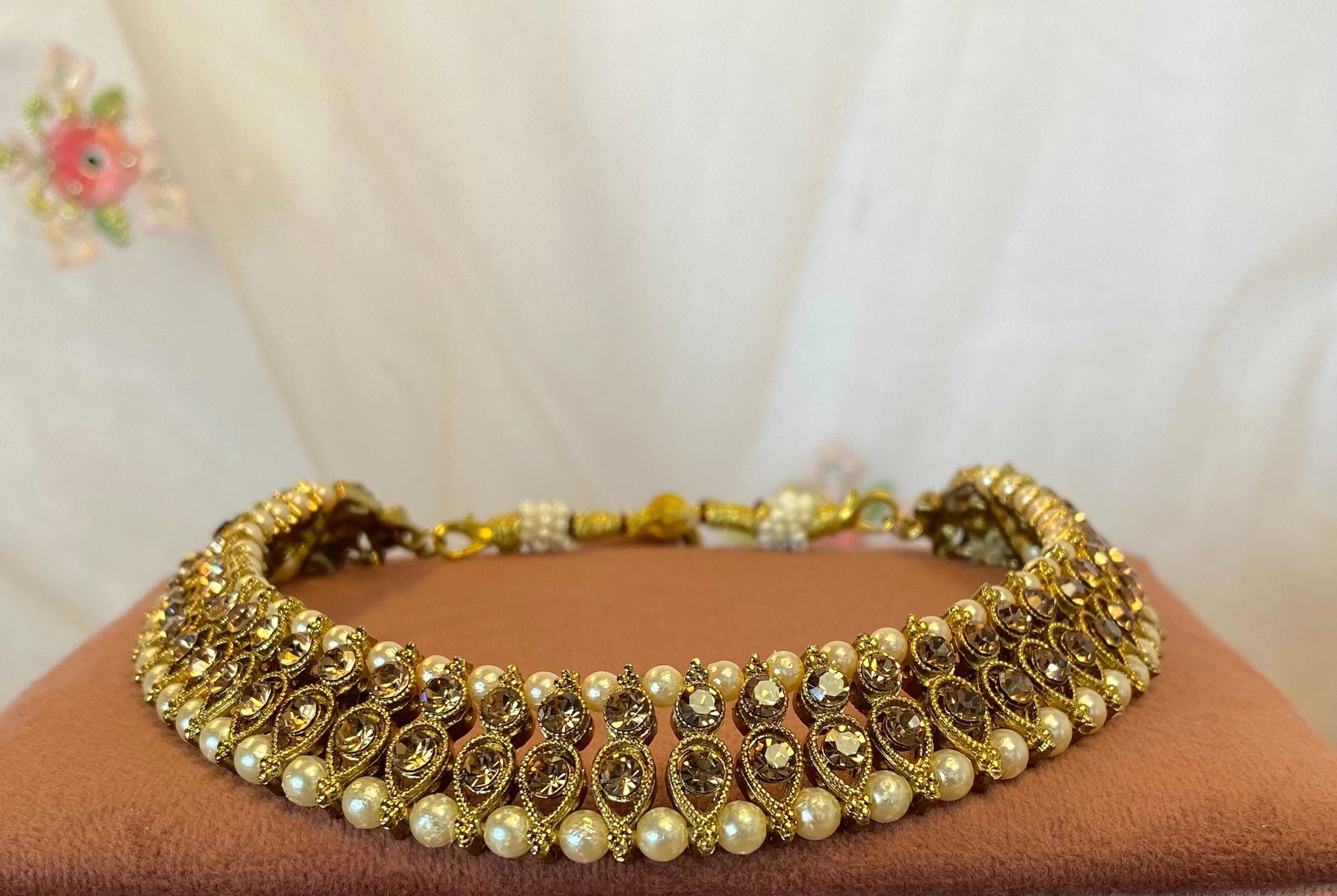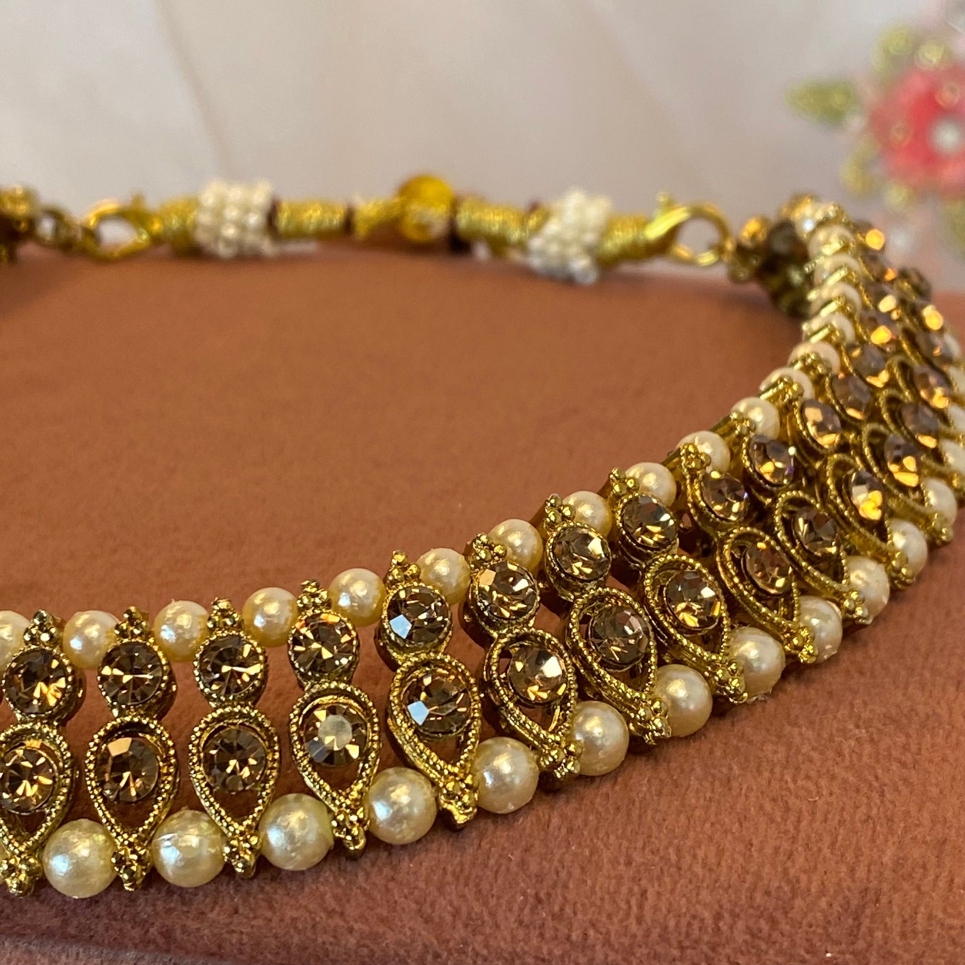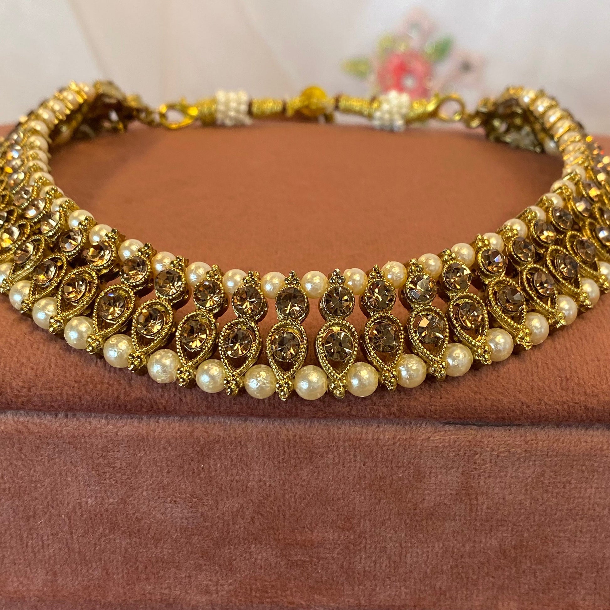 Single choker with antique gold base and golden rhinestones. Pretty pearl detail