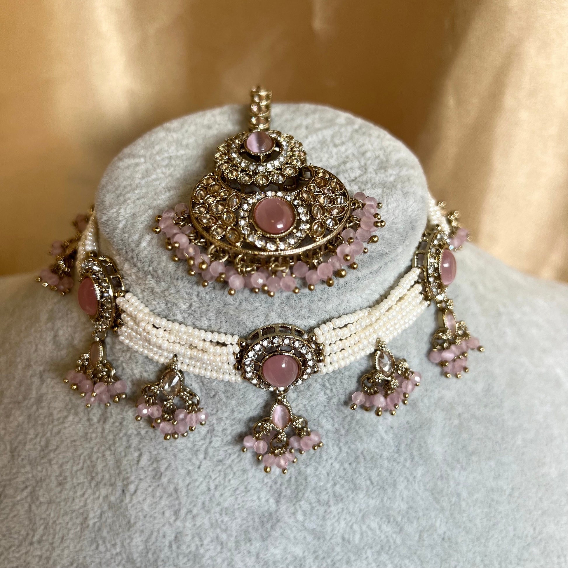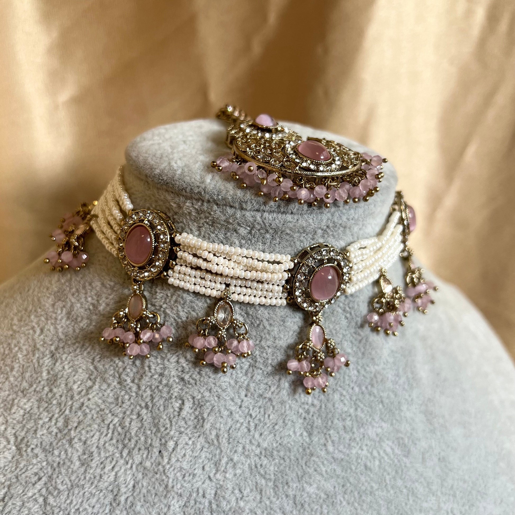 Stylish pink choker set adorned with sparkling silver rhinestones and pink beads, pearl detail