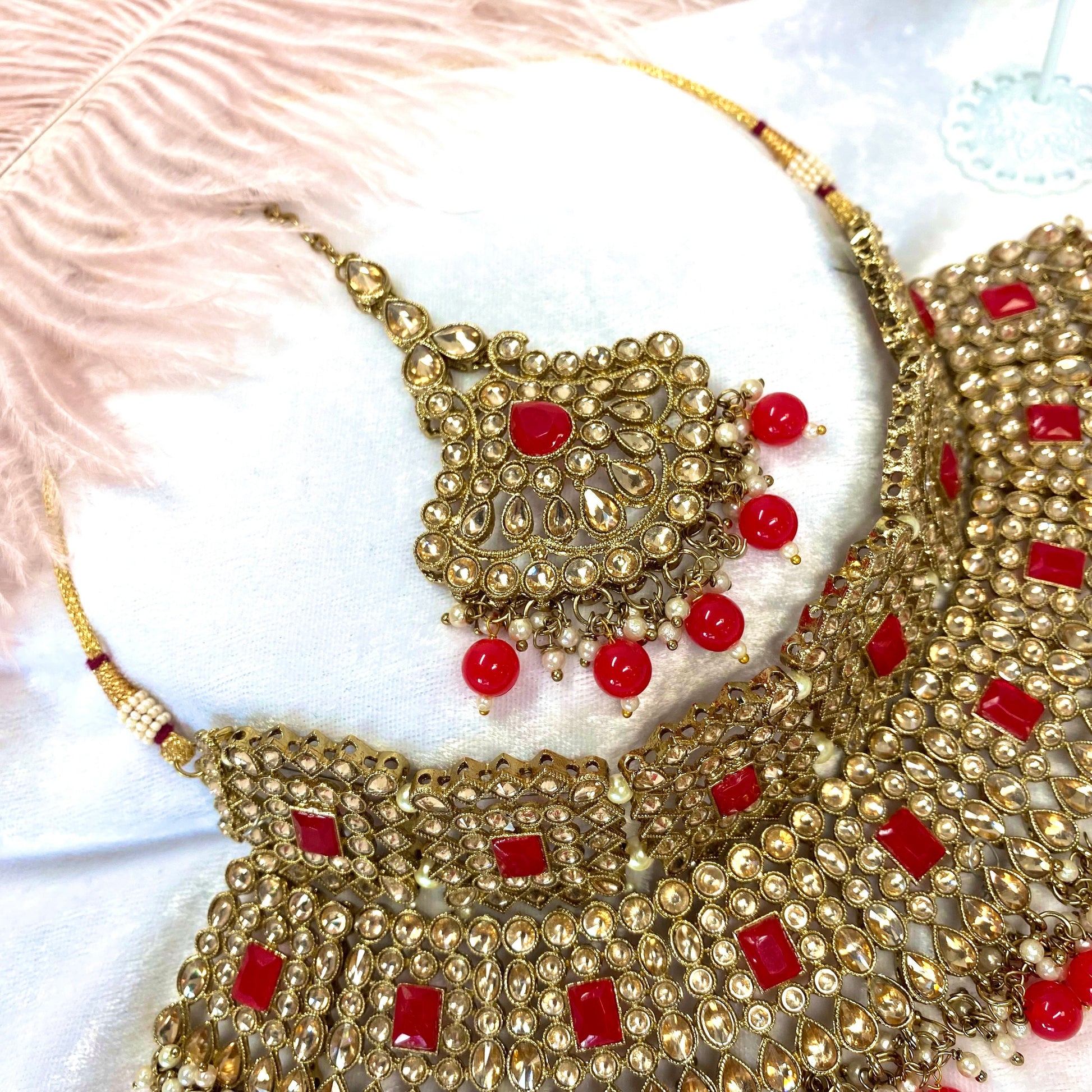 Beautiful bridal chunky choker set in red or peach with earring and tikka or single grey and red choker piece. Antique gold base with stunning champagne zircon crystals.