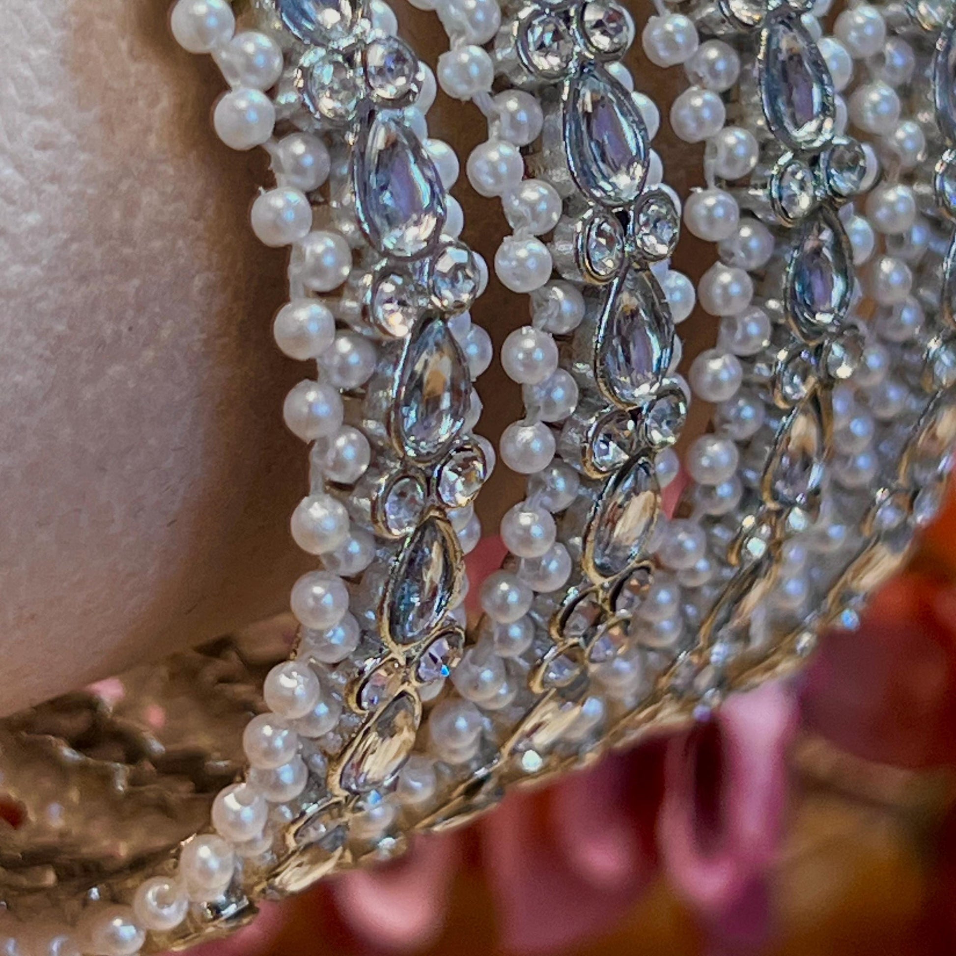 Beautiful pair of bangles (0.5 inch thick) with 1 inch drop Jhumka detail. Antique gold base and clear crystals or Silver