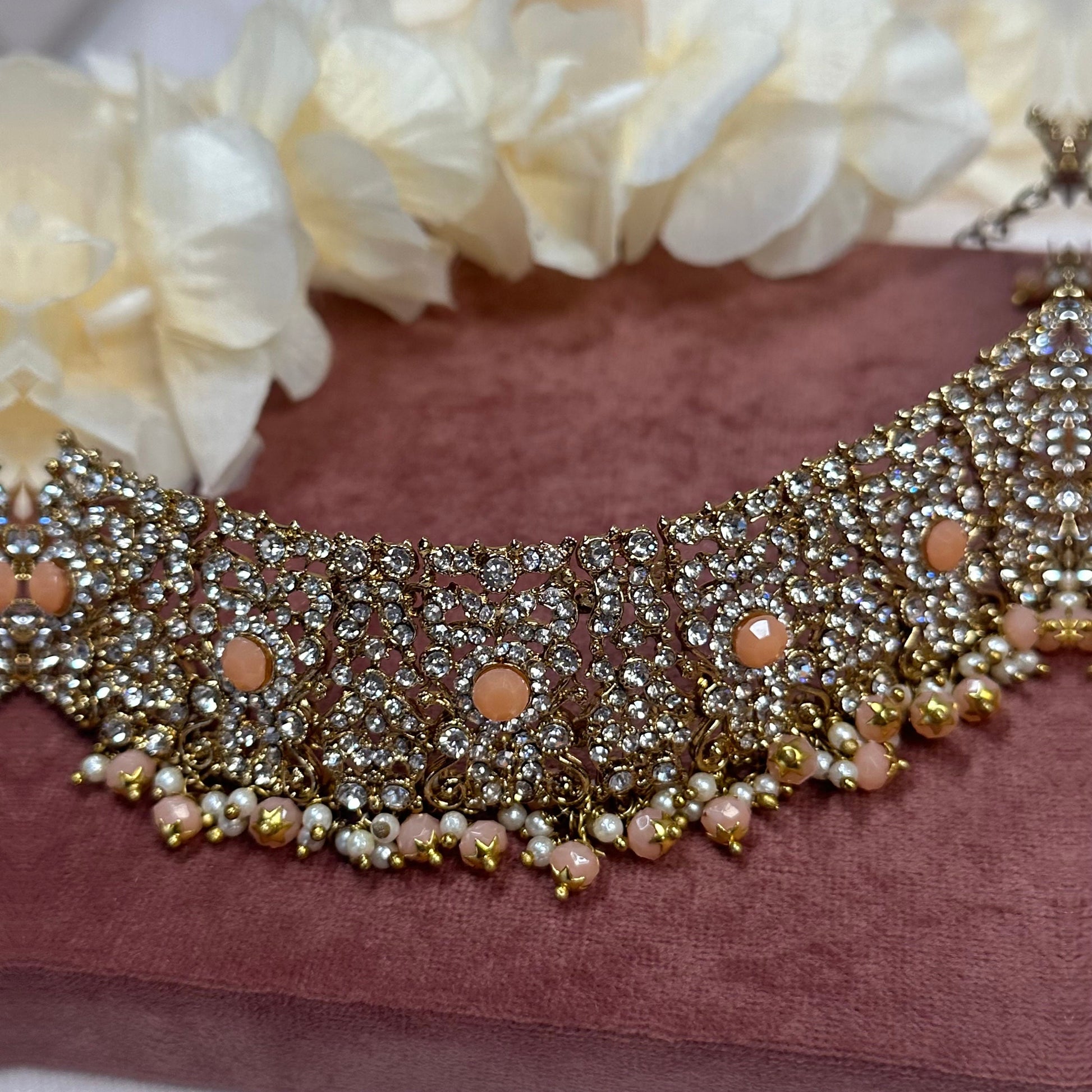 This beautiful crystal stones choker with peach gems is sold as a single piece.