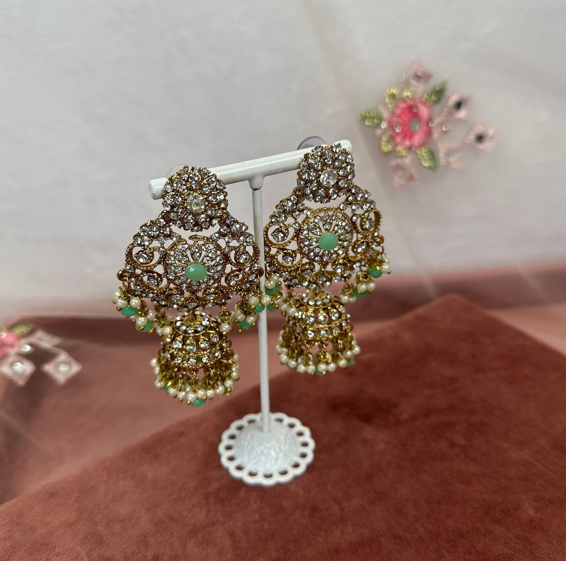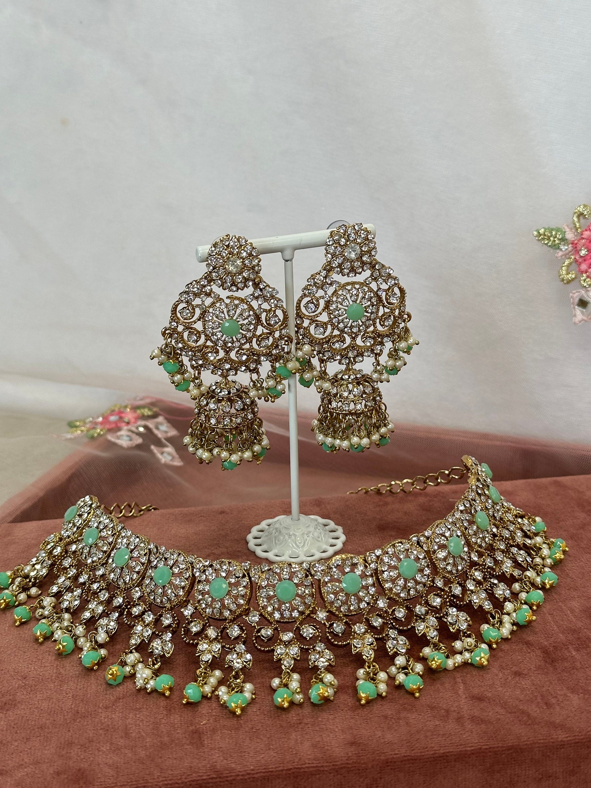 This beautiful crystal stones choker set comes in mint colour with matching jhumka earrings.
