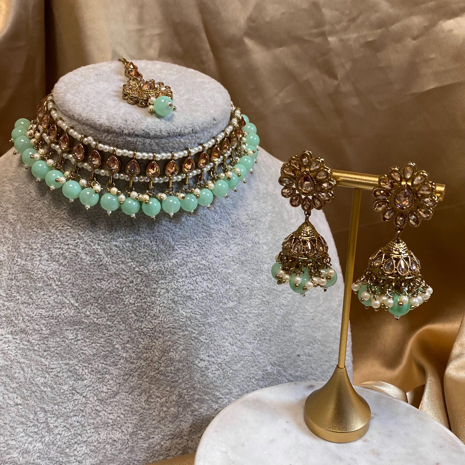 Crystal Choker Set - Mint Earring/ Tikka/ Tikli/ Indian/ Pakistani/Fashion Jewellery/ Gift for Women