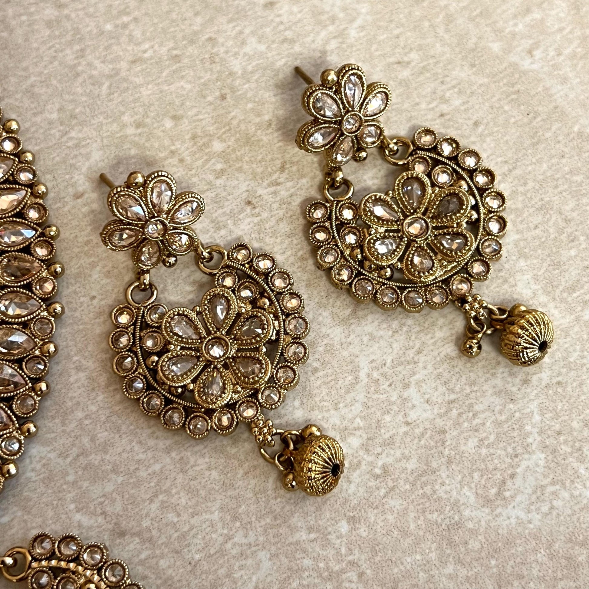 Simple but elegant necklace set with the cutest earring and tikka. Antique gold with champagne zircon crystals or Silver with clear zircon Crystal.