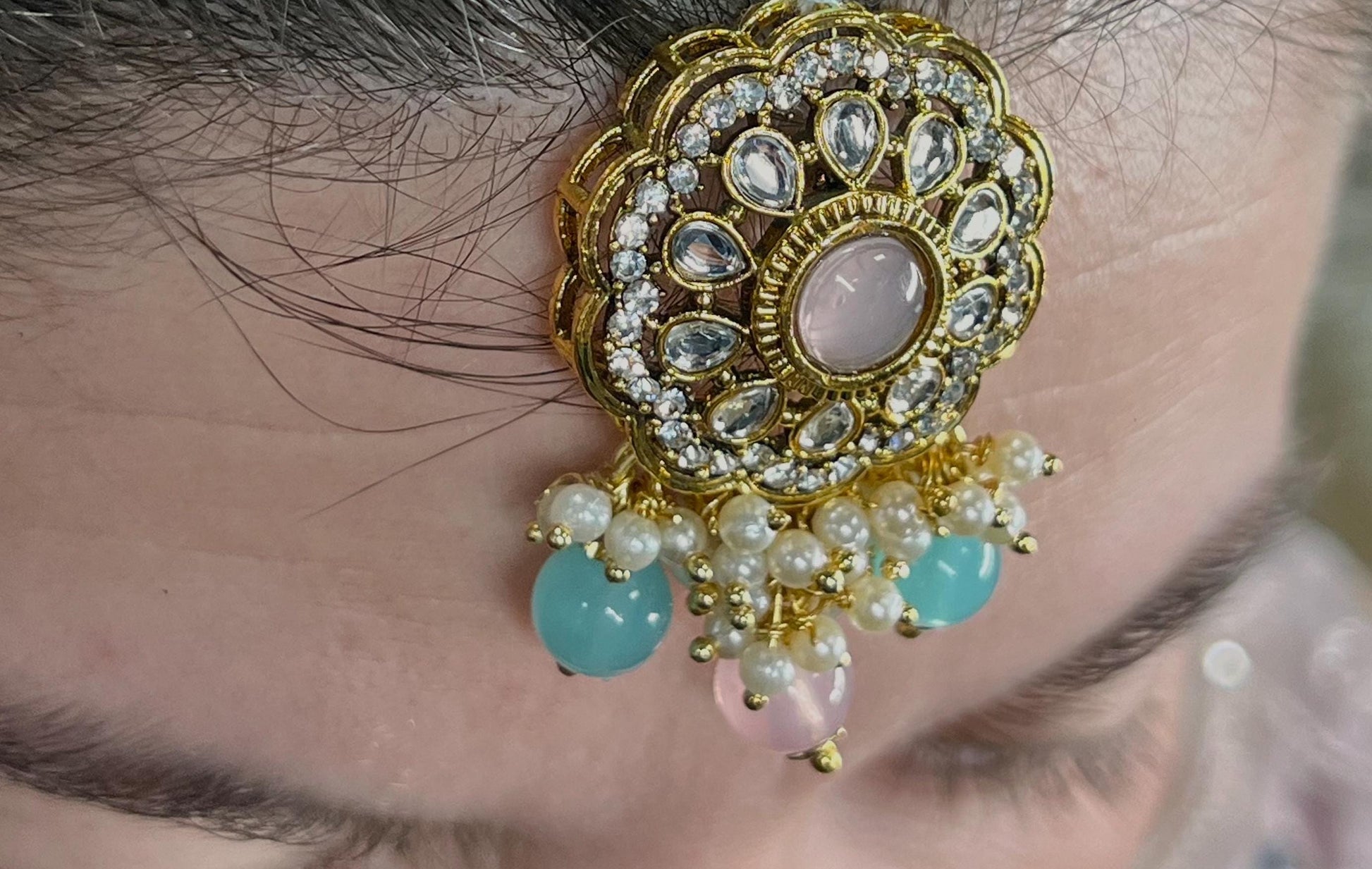 This gorgeous light weight gold plated choker with sparkling clear rhinestones with pastel pink and blue bead work. Choker is flexible to fit any size. Adjustable string available. Includes earrings 2.5 inch length and includes matching tikka.