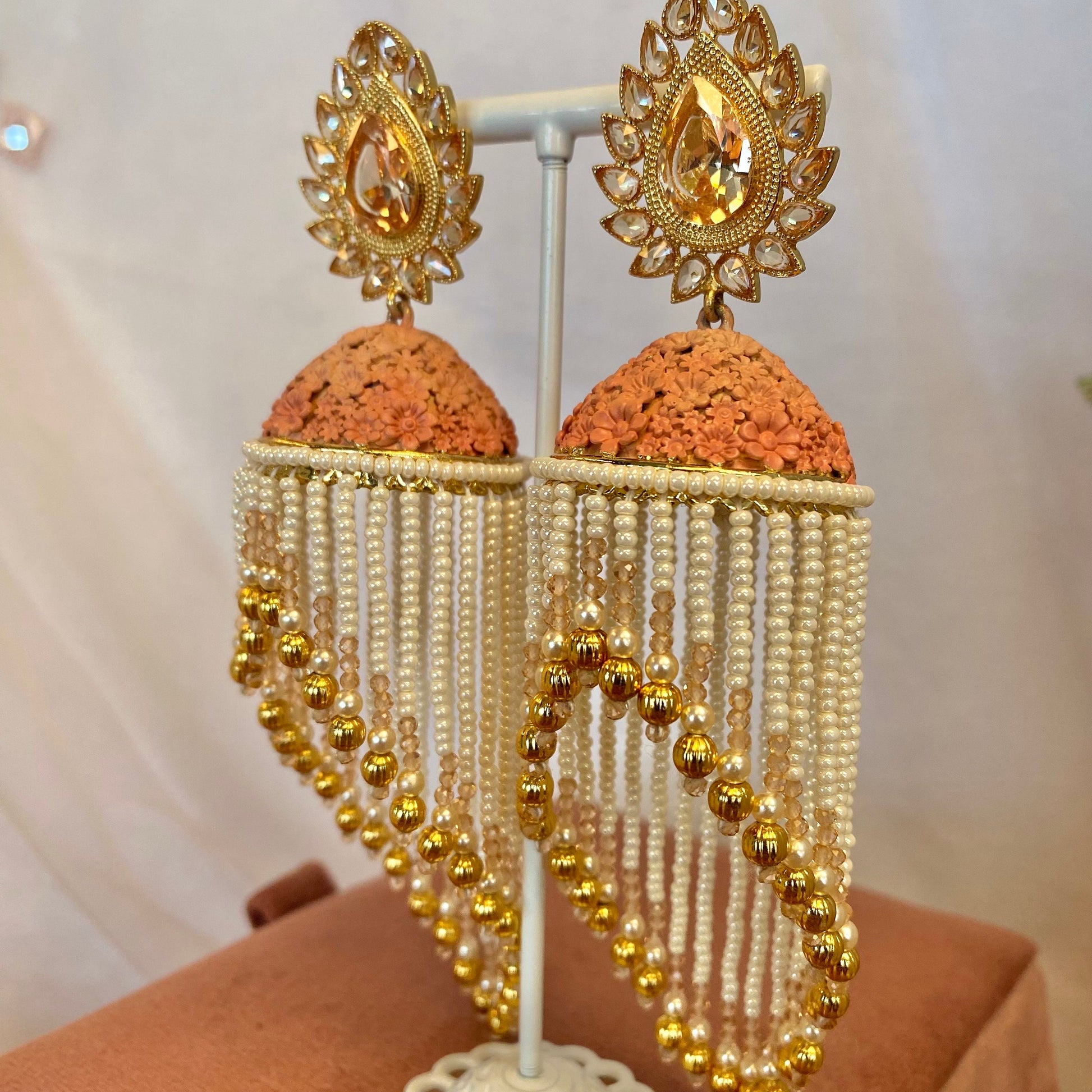 This stunnning golden crystal earrings had added pearl tassles and peach floral detailing.