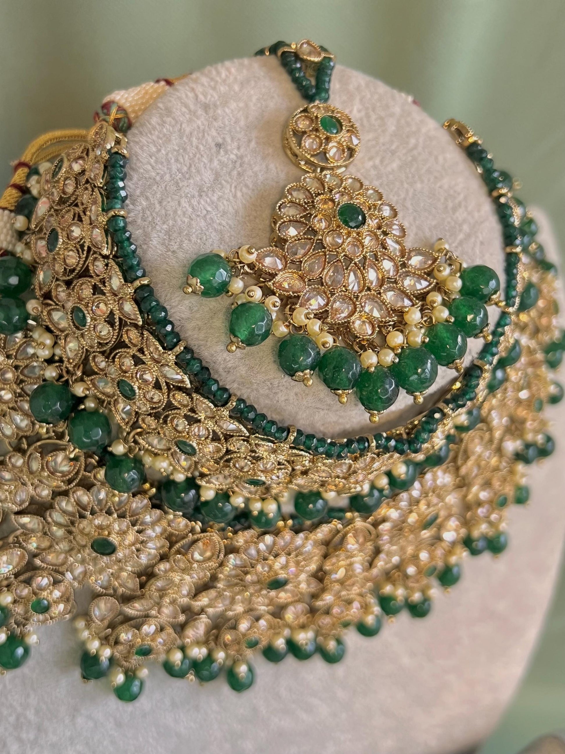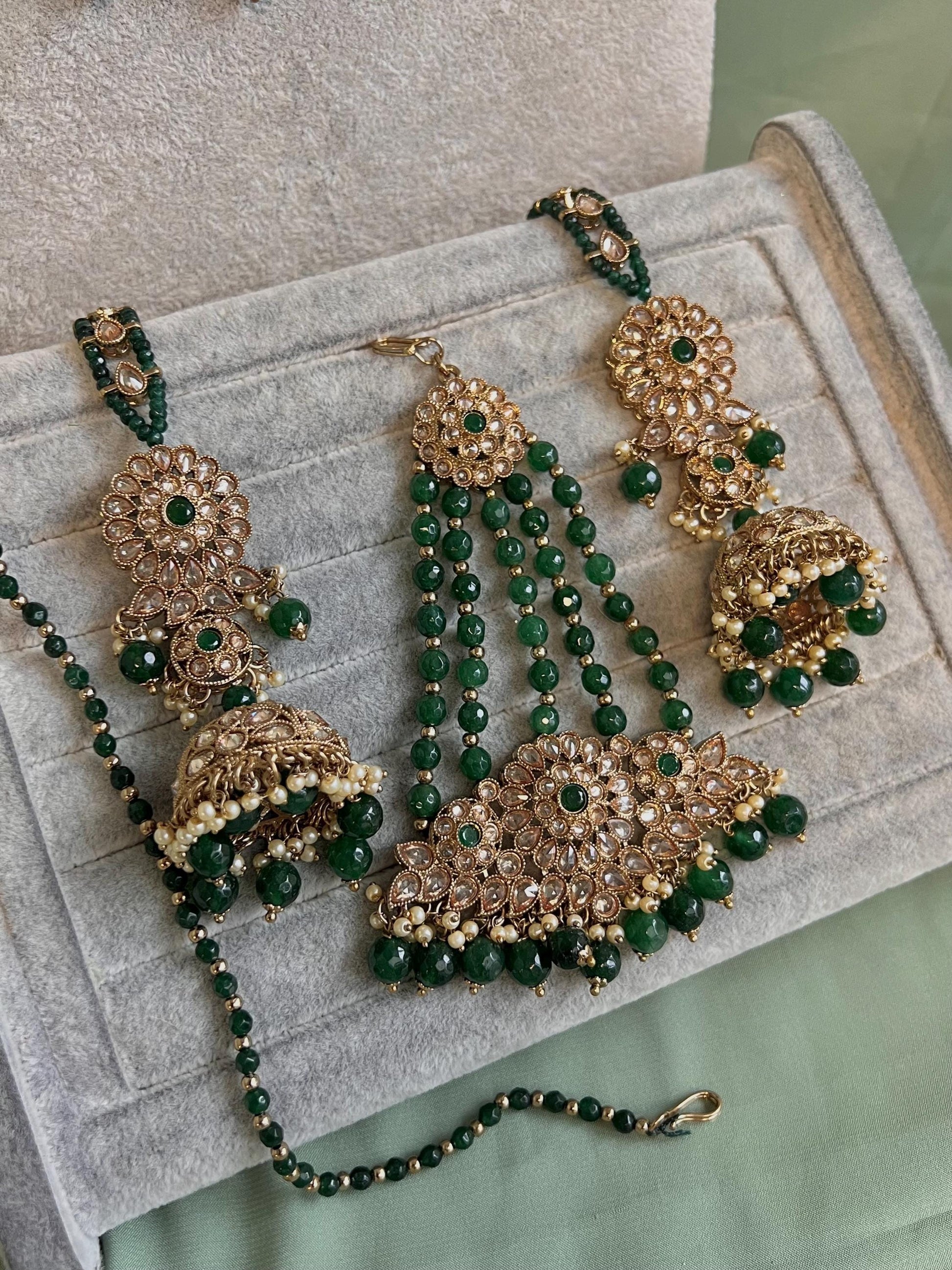 Green & champagne bridal full set includes choker, necklace, Jhumka earrings with attached ear chains, medium slide type nose ring, jhumar and tikka.
