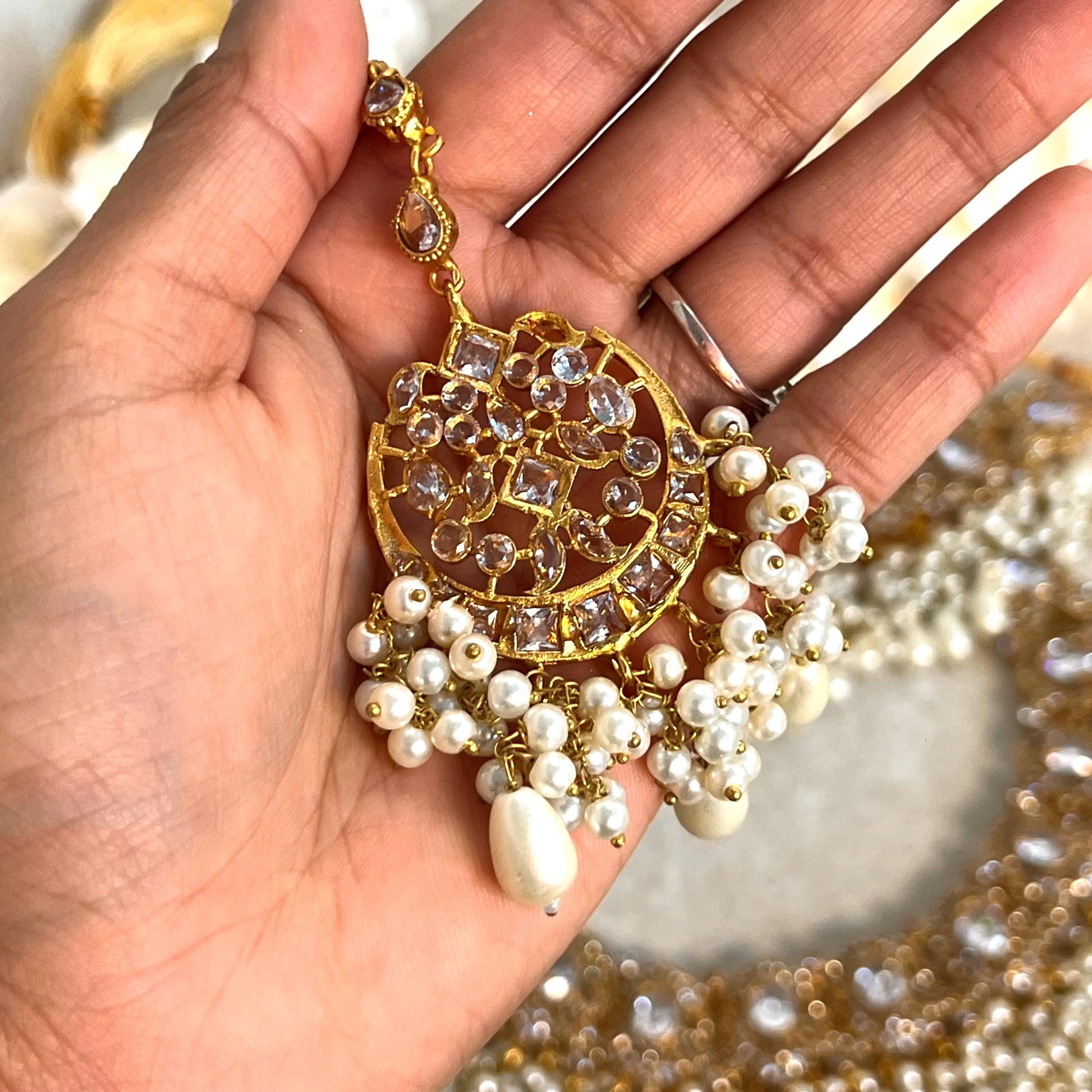 Full Bridal Set - Antique Gold Clear Rhinestone Indian / Pakistani Style/Necklace, Choker, Chain Jhumka Earring, Tikka, Jhumar Wedding/ Gift