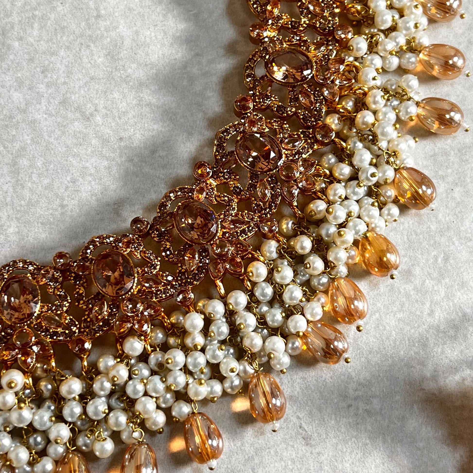 Beautiful intricate design on antique gold base with champagne/ Golden rhinestone and zircon crystals