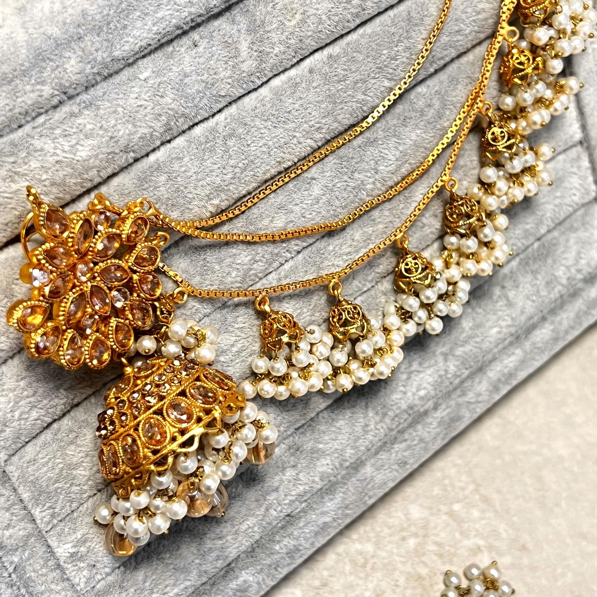 Full Bridal Set - Antique Gold Golden Rhinestone/ ZirconIndian / Pakistani Style/Necklace, Chain Jhumka Earring, Tikka, Jhumar Wedding/ Gift