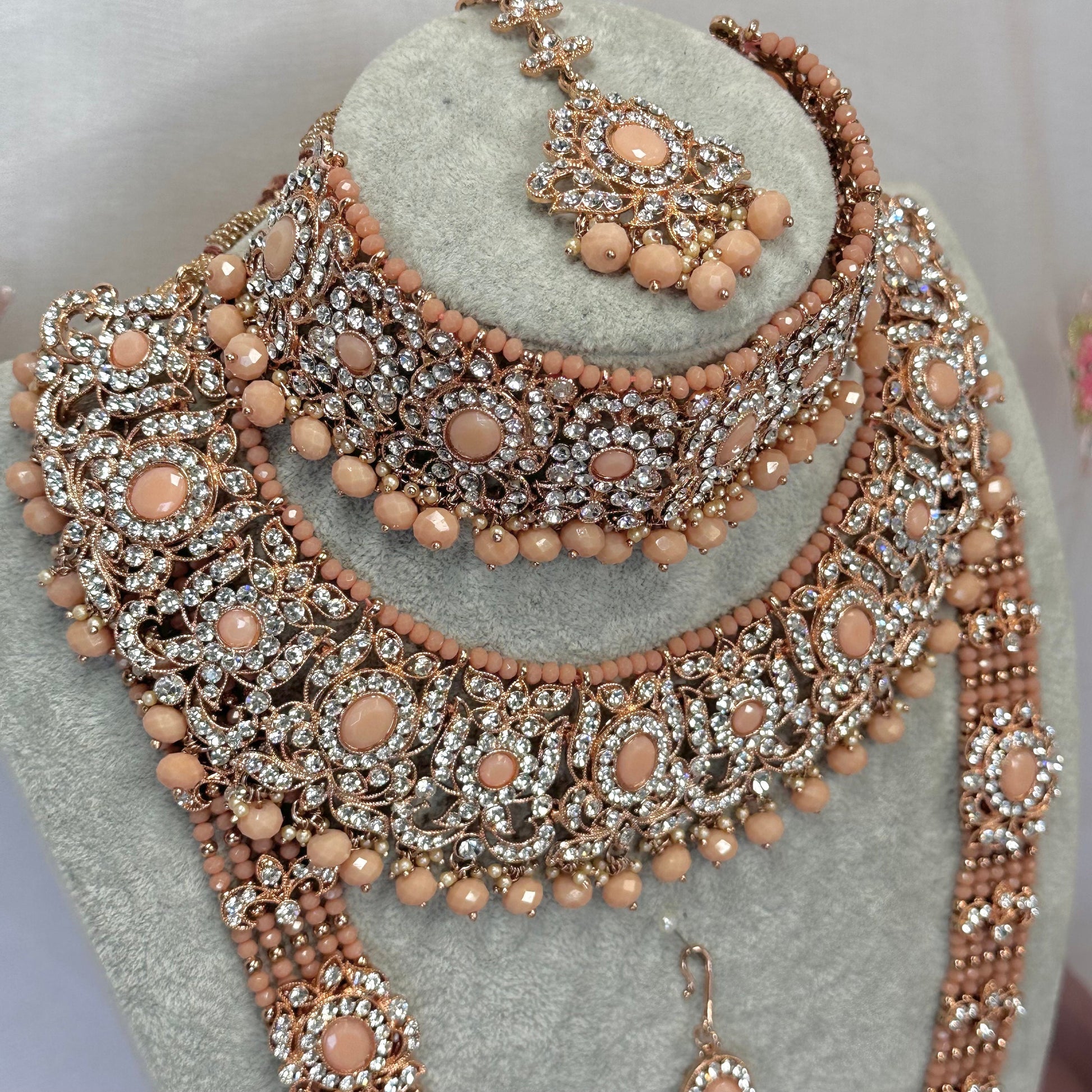 Full Bridal Set - Peach Indian/ Pakistani Style With Choker, Necklace, Earring/Mala/ Long Necklace/ Haar/ Jhumar/ Jhoomar/Wedding