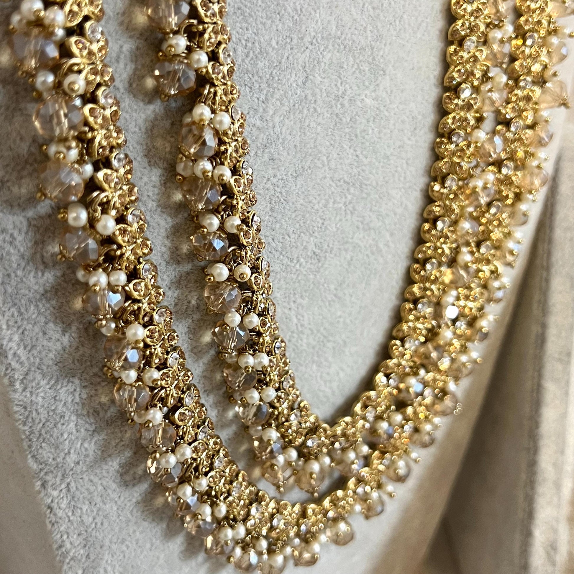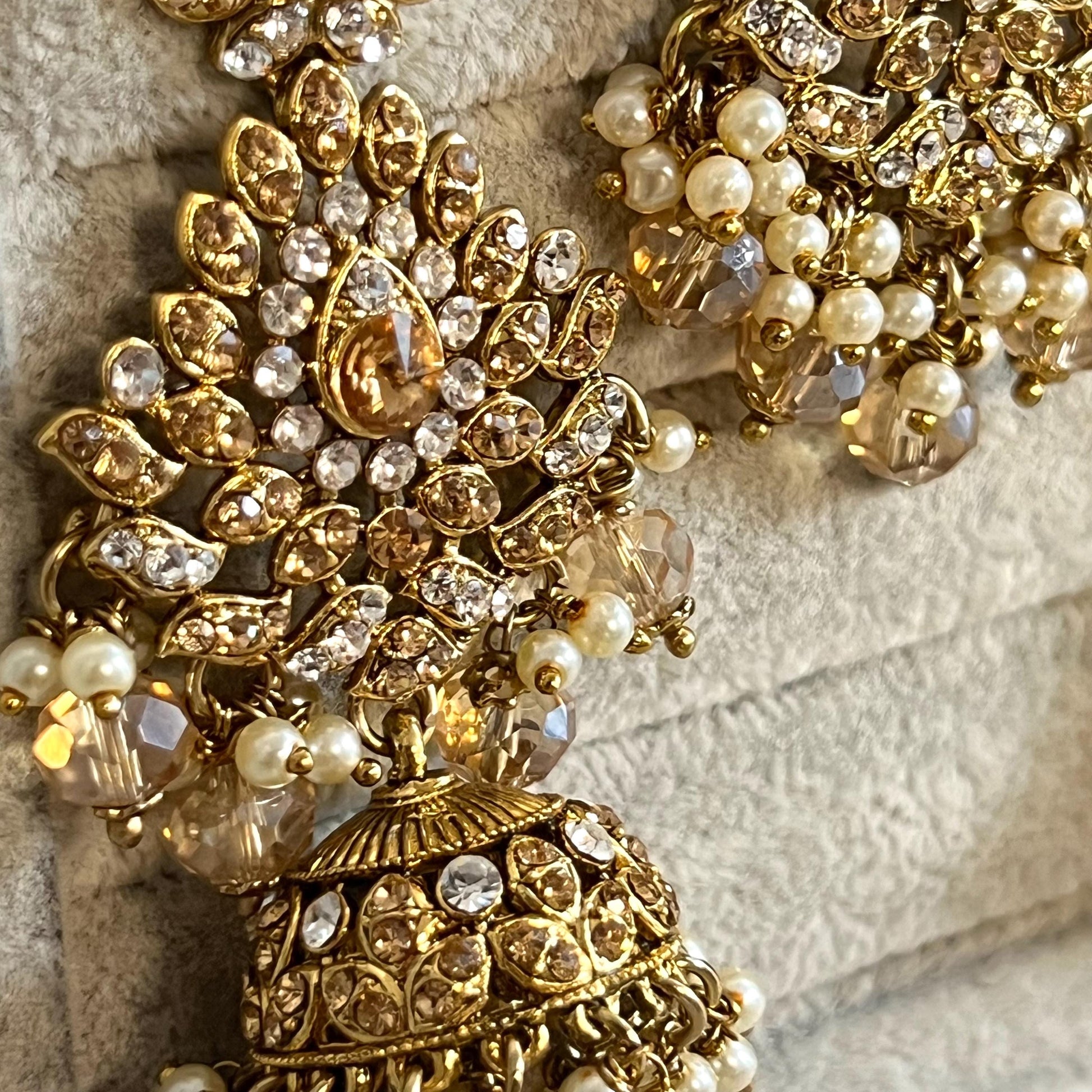 Gold /Antique Gold with Golden Rhinestone Long Necklace set With Jhumka Earring and Tikka/long necklace/ Haar/ Mala/ Earring/Wedding/Fashion
