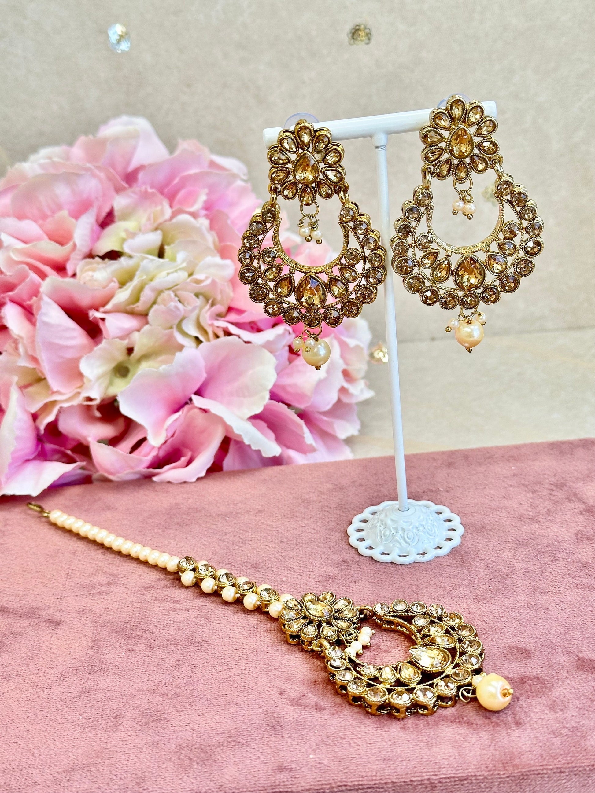 Gold Earrings & Tikka Set/ Indian Gold Earrings/ Fashion Jewellery/ Gift for Women/Indian/Pakistani style