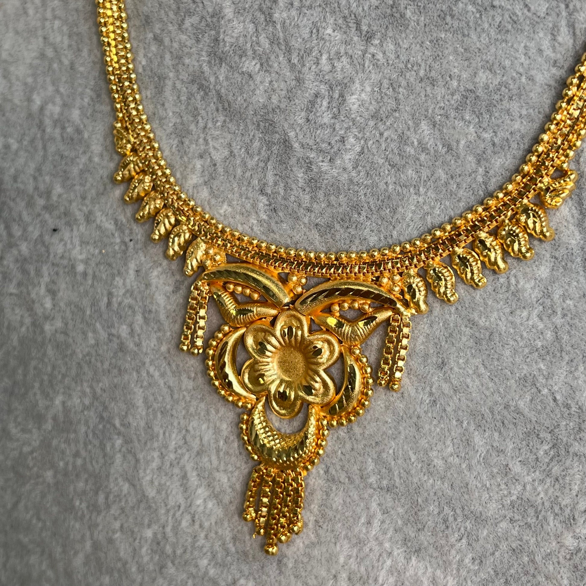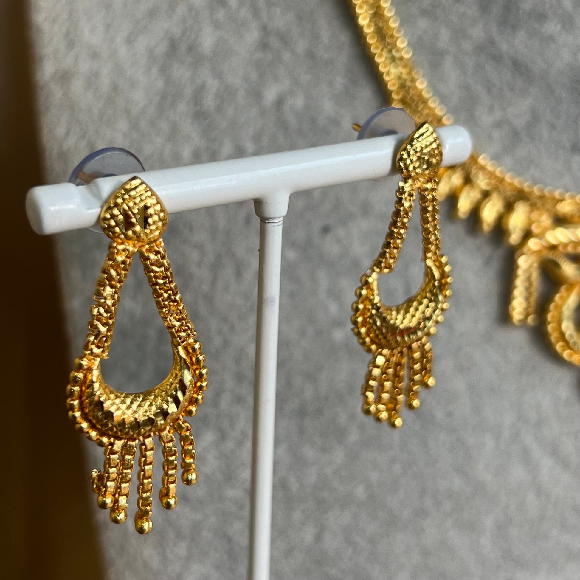 Stunning gold necklace comes with matching earrings. Please note tikka isn‘t included.