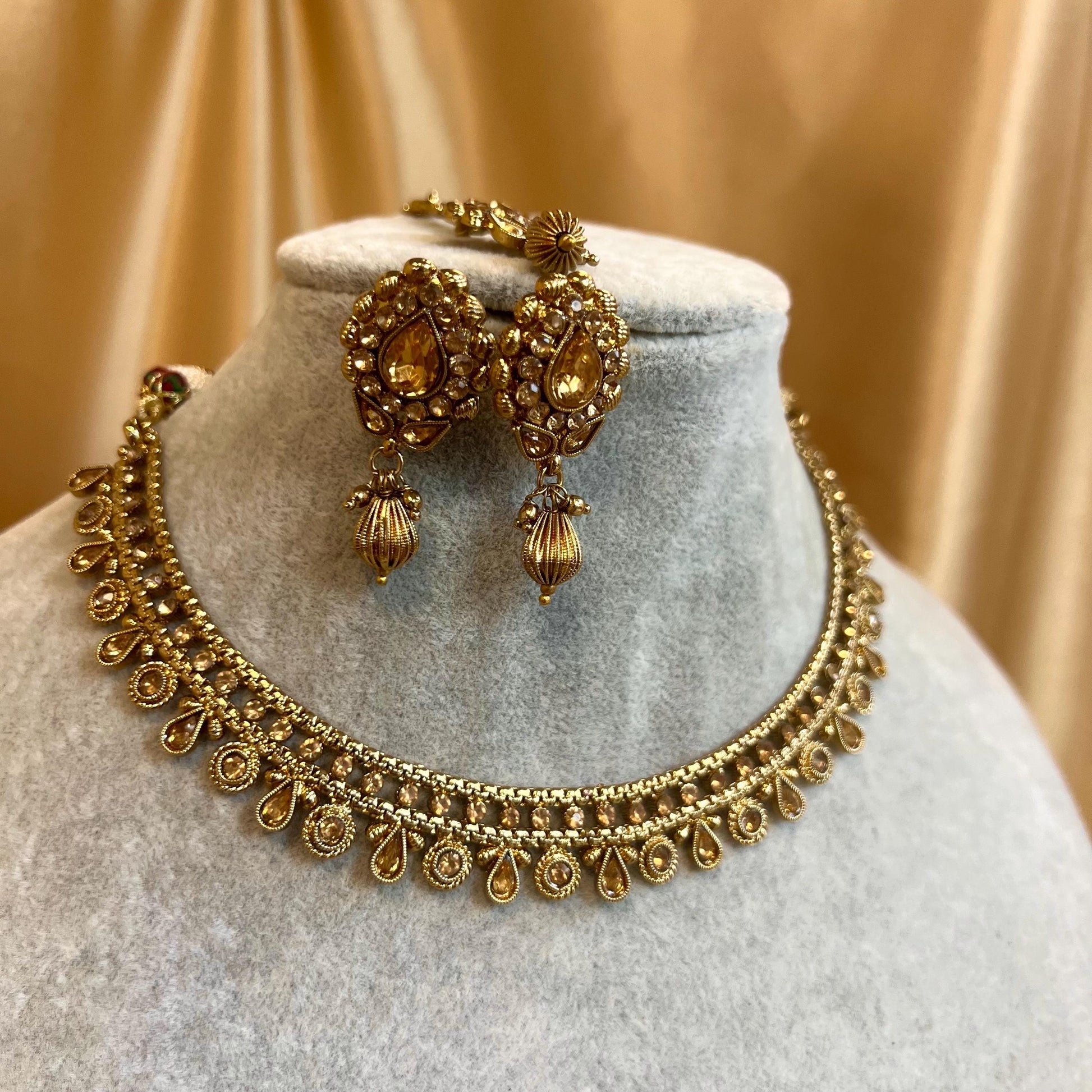 Gold Thin Necklace Set Earring/ Tikka/ Tikli/ Indian/ Pakistani/Fashion Jewellery/ Gift for Women/ Antique Gold with Champagne crystals