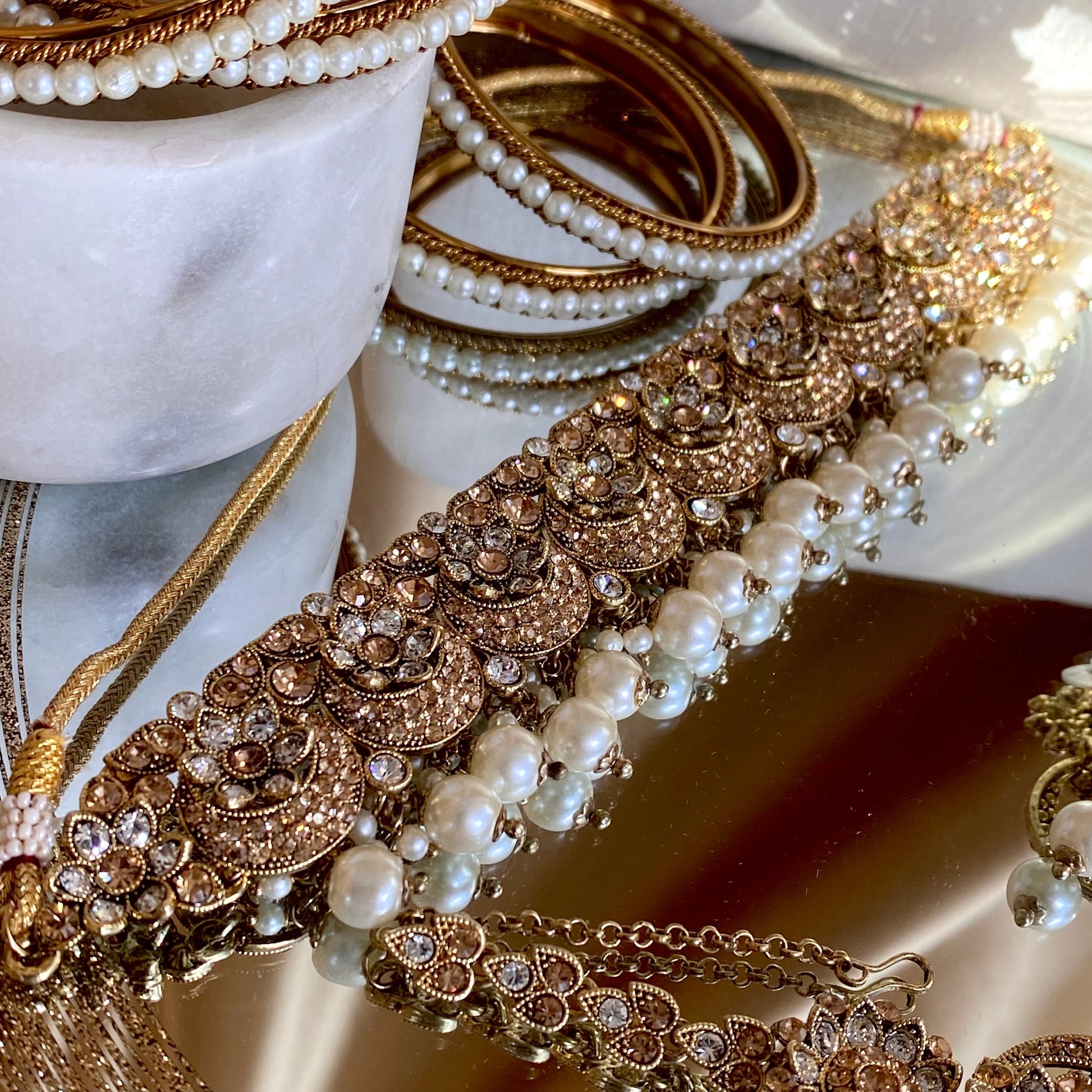 Golden/ Clear Choker Set/ Pearl/ Earring/Tikka/Indian/ Pakistani/Fashion Jewellery/