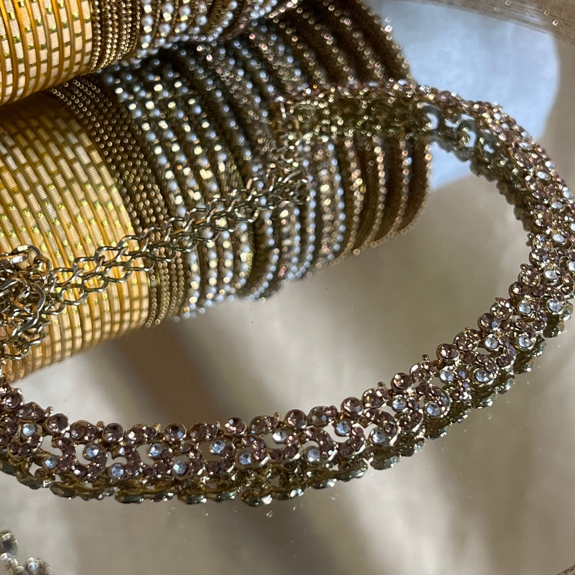 Simple but elegant necklace set with the long earring. Antique gold base with gold and silver rhinestones.