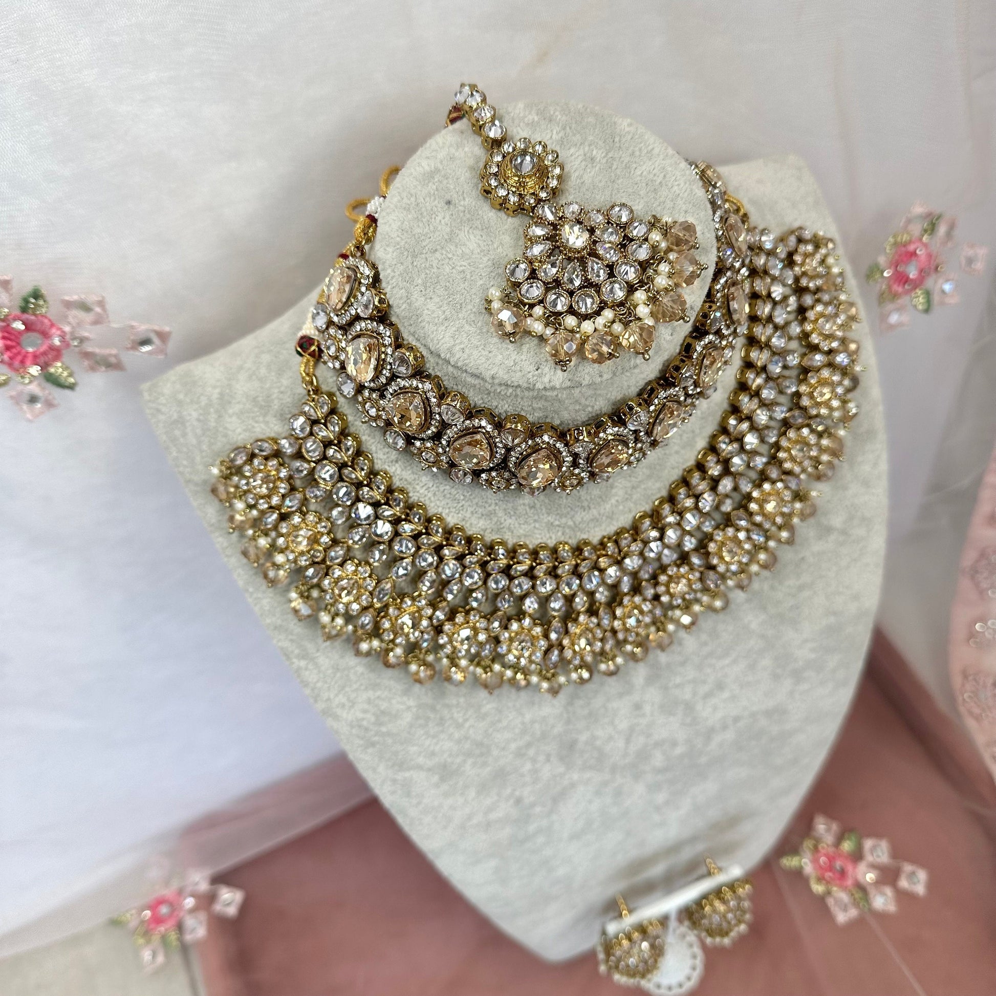 Golden Glow Bridal Set Indian/ Pakistani Style/ Choker/ Necklace/ Jhumka Earring/ Tikka/Tikli/ Wedding